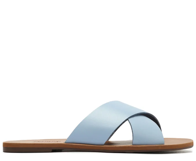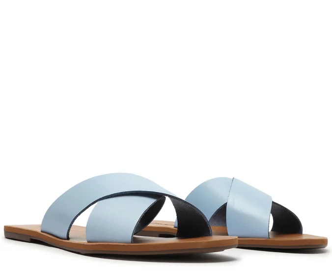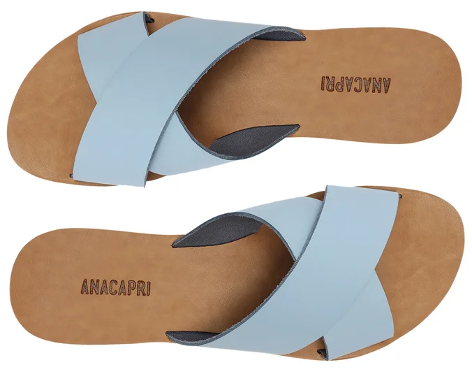 Rasteira de couro azul blueberry, com duas tiras largas cruzadas na gáspea .Palmilha marrom com o nome da marca ANACAPRI. Deixa dedos e calcanhar à mostra. Nesse modelo aconselhamos a compra de um tamanho maior do que sua numeração convencional.