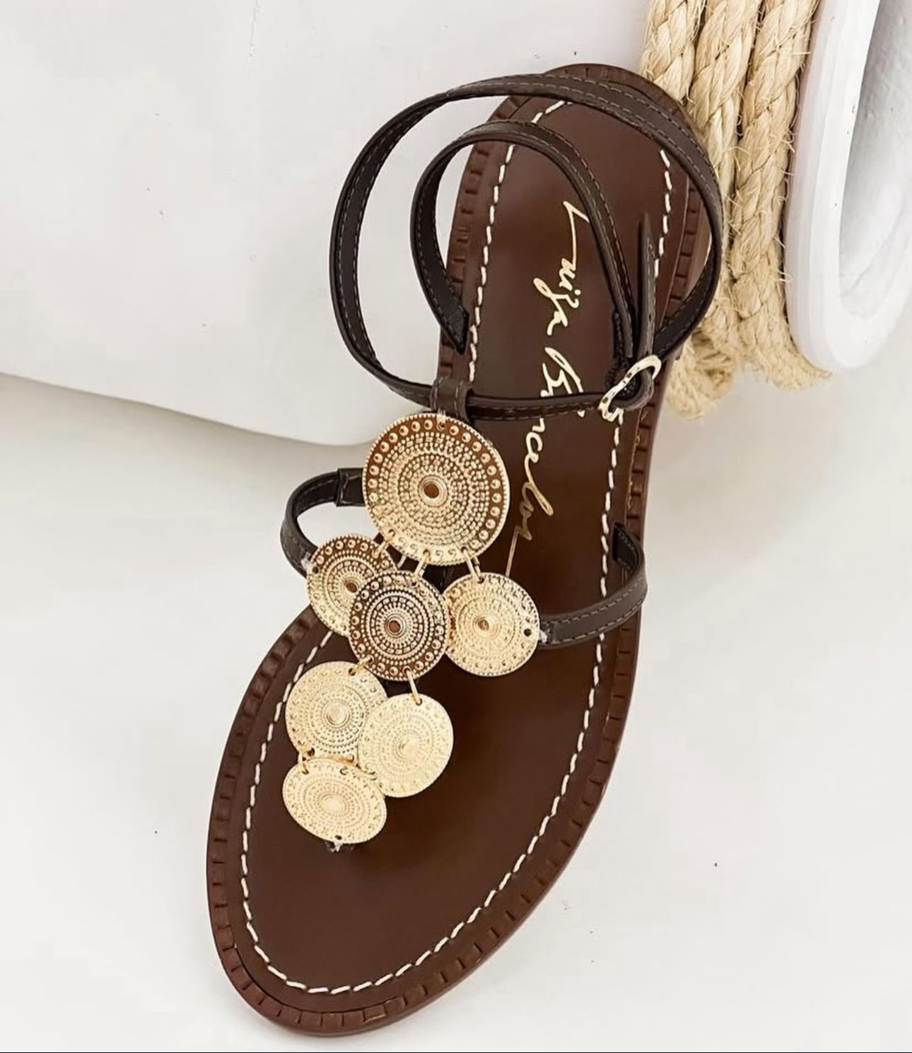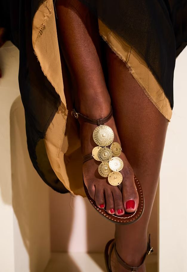 Com visual leve e acabamento elegante, esta rasteira em couro café combina o minimalismo das tiras finas com o impacto das aplicações metalizadas em ouro. Os discos em diferentes tamanhos criam movimento e brilho sutil, valorizando o pé com sofisticação. Uma peça versátil para produções frescas com informação de moda.