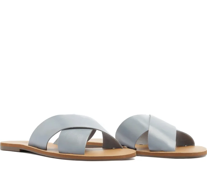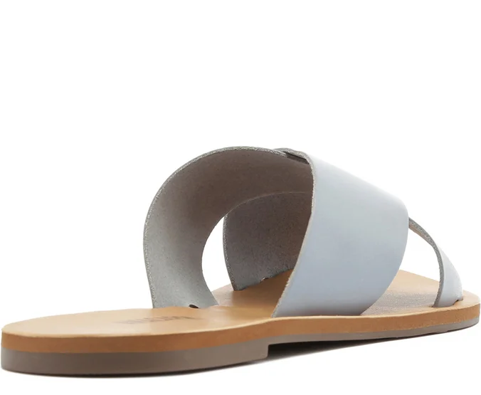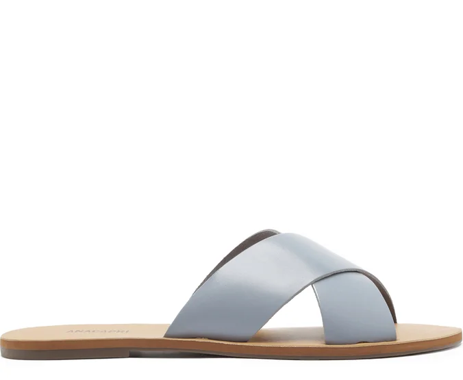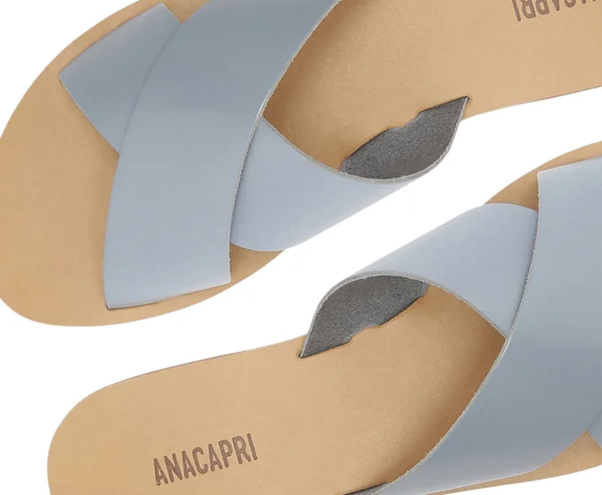 Rasteira Tiras Cruzadas Azul. Rasteirinha de couro azul com duas tiras grossas na gáspea que se cruzam entre si. Palmilha nude com o nome da marca. Deixa dedos e calcanhar à mostra. Nesse modelo aconselhamos a compra de um tamanho maior do que sua numeração convencional.