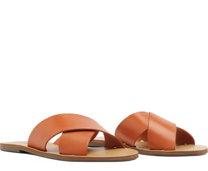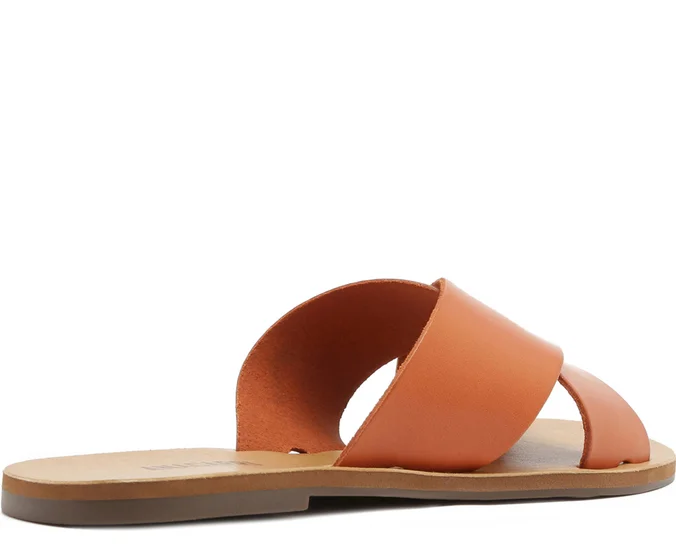 Rasteira Tiras Cruzadas Marrom Damasco. Rasteirinha de couro marrom com duas tiras grossas na gáspea que se cruzam entre si. Palmilha nude com o nome da marca. Deixa dedos e calcanhar à mostra. Nesse modelo aconselhamos a compra de um tamanho maior do que sua numeração convencional.