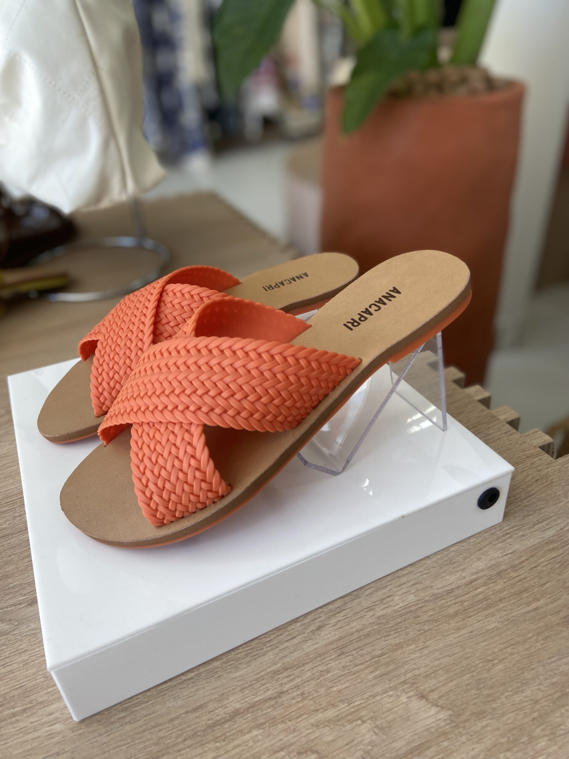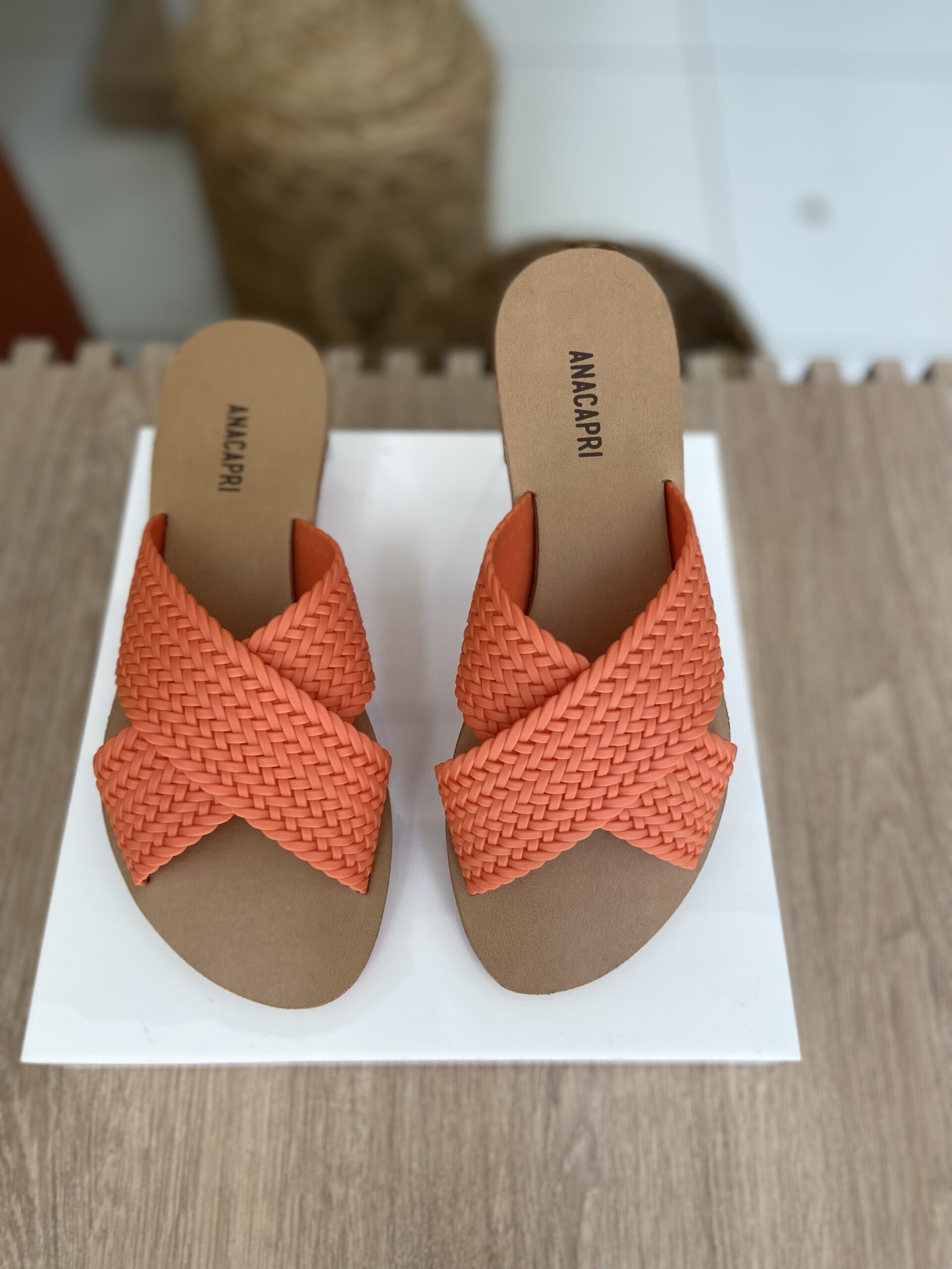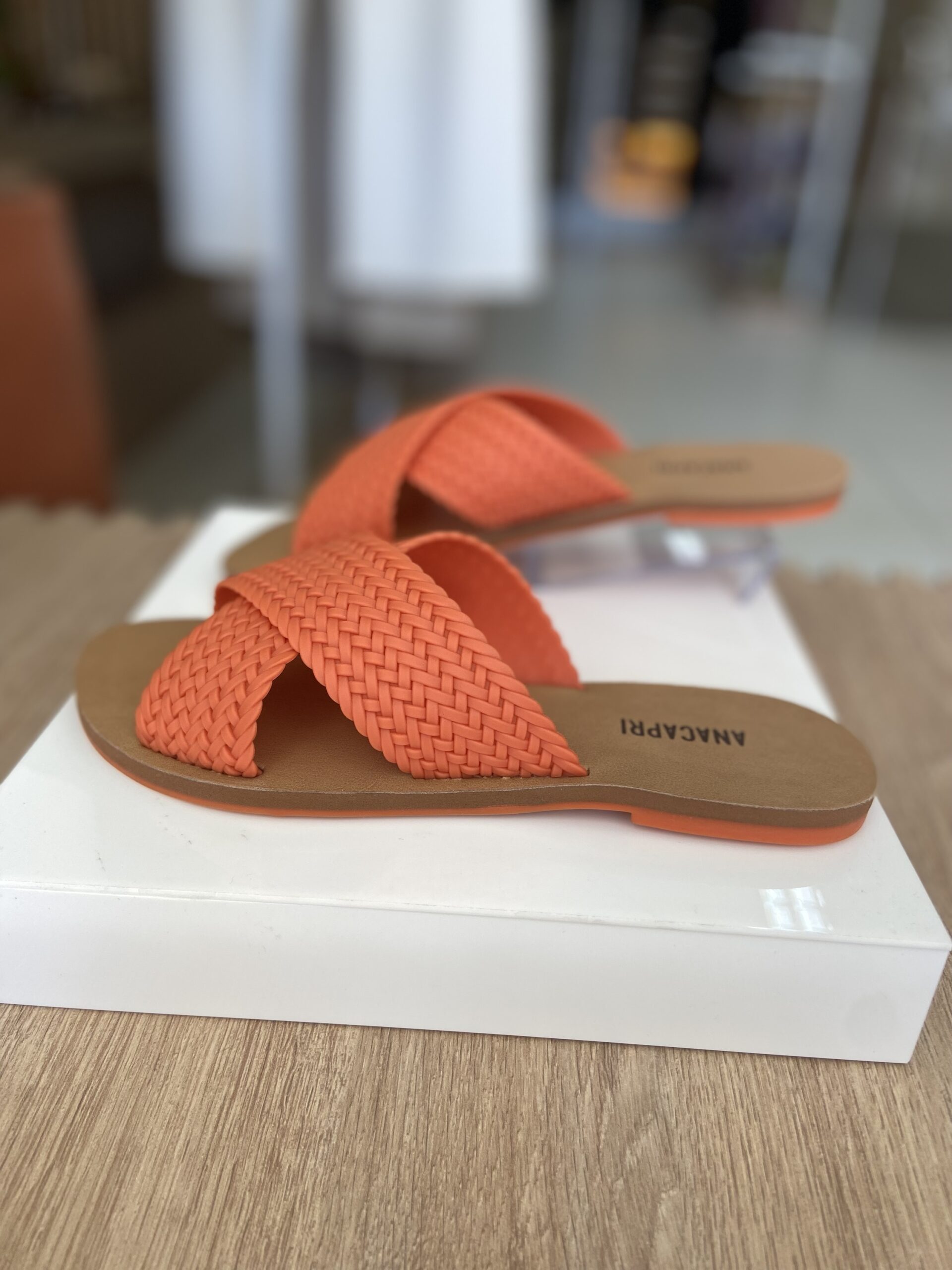 Rasteira Tiras Cruzadas Trançada Laranja. Possui duas tiras cruzadas na gáspea com acabamento trançaado. Palmilha marrom com o nome da marca, deixa dedos e calcanhar á mostra.