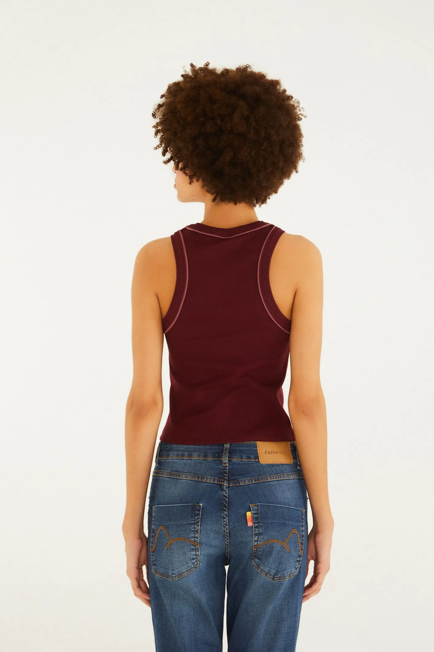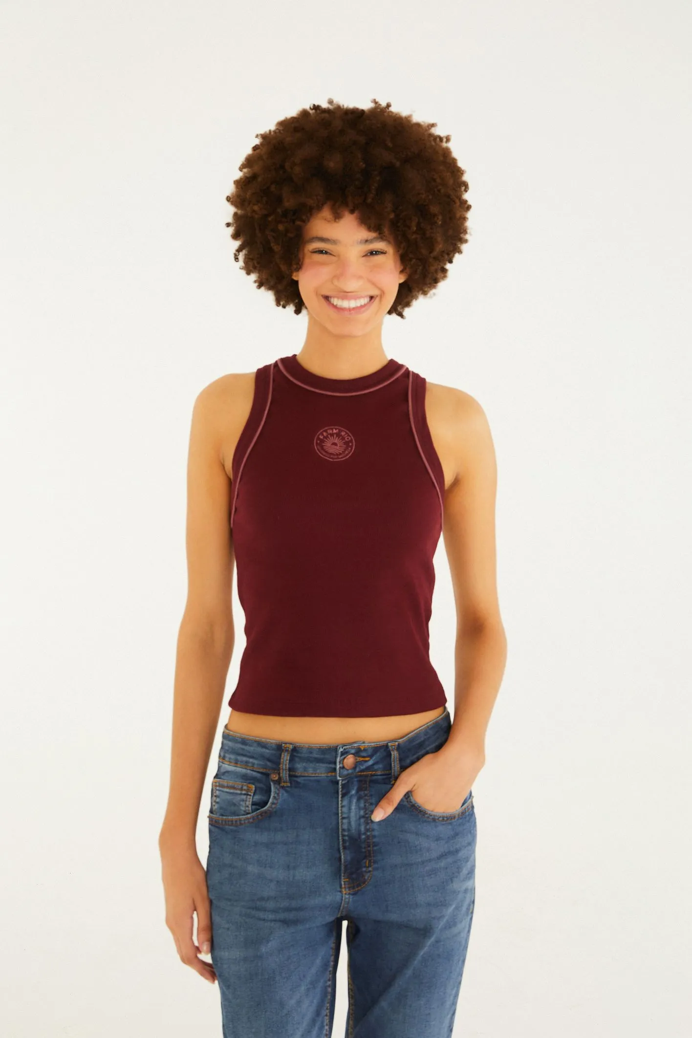 regata bicolor bordada sol da FARM é um toque de autenticidade para seu guarda-roupa. com alças largas e gola alta, ela é perfeita para dias casuais ou saídas descontraídas. o bordado delicado eleva seu visual, tornando-se um destaque em qualquer ocasião. FARM Rio, coleção Carioca – inverno 26.