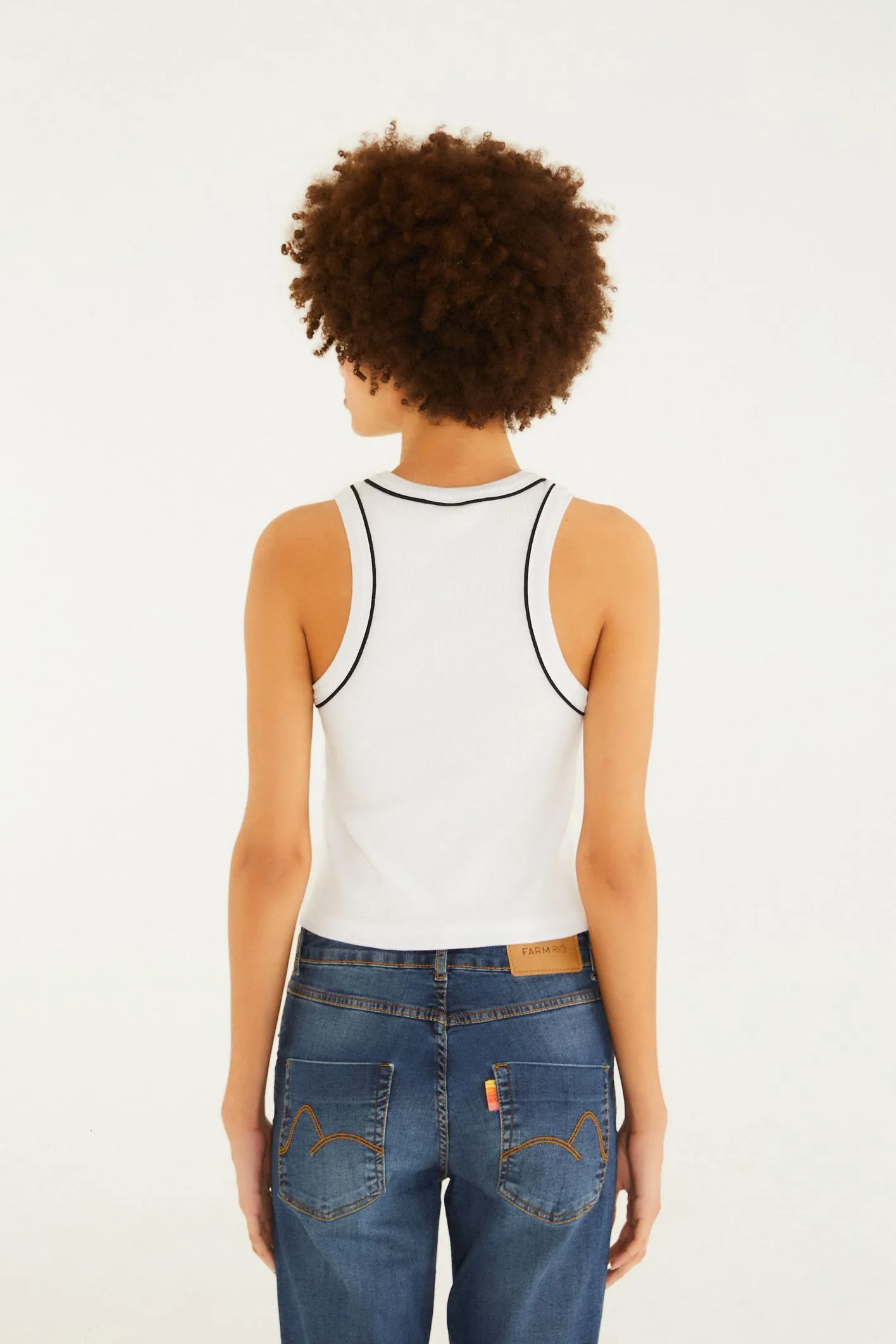 regata bicolor bordada sol da FARM é um toque de autenticidade para seu guarda-roupa. com alças largas e gola alta, ela é perfeita para dias casuais ou saídas descontraídas. o bordado delicado eleva seu visual, tornando-se um destaque em qualquer ocasião. FARM Rio, coleção Carioca – inverno 26.