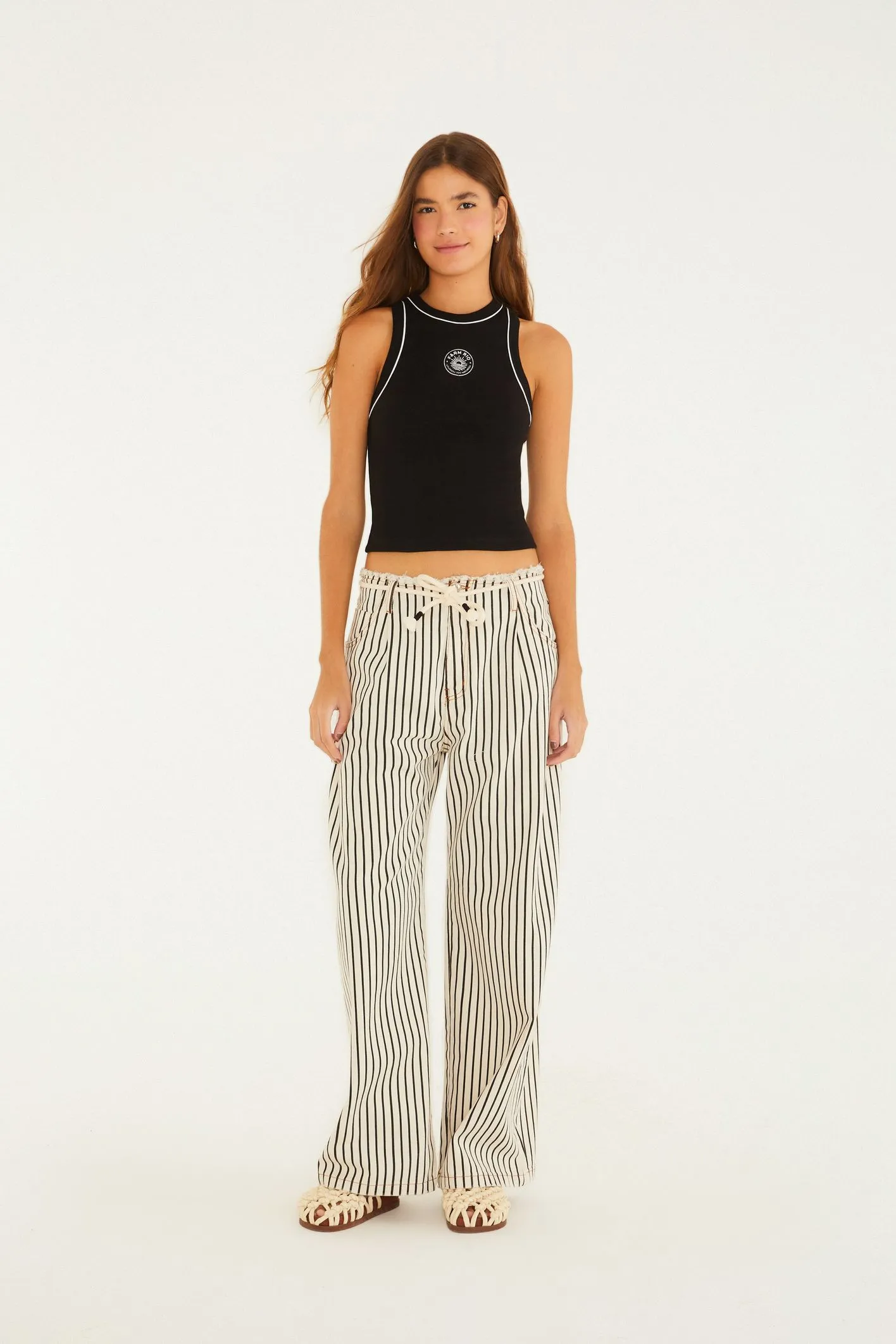 regata bicolor bordada sol da FARM é um toque de autenticidade para seu guarda-roupa. com alças largas e gola alta, ela é perfeita para dias casuais ou saídas descontraídas. o bordado delicado eleva seu visual, tornando-se um destaque em qualquer ocasião. FARM Rio, coleção Carioca – inverno 26.
