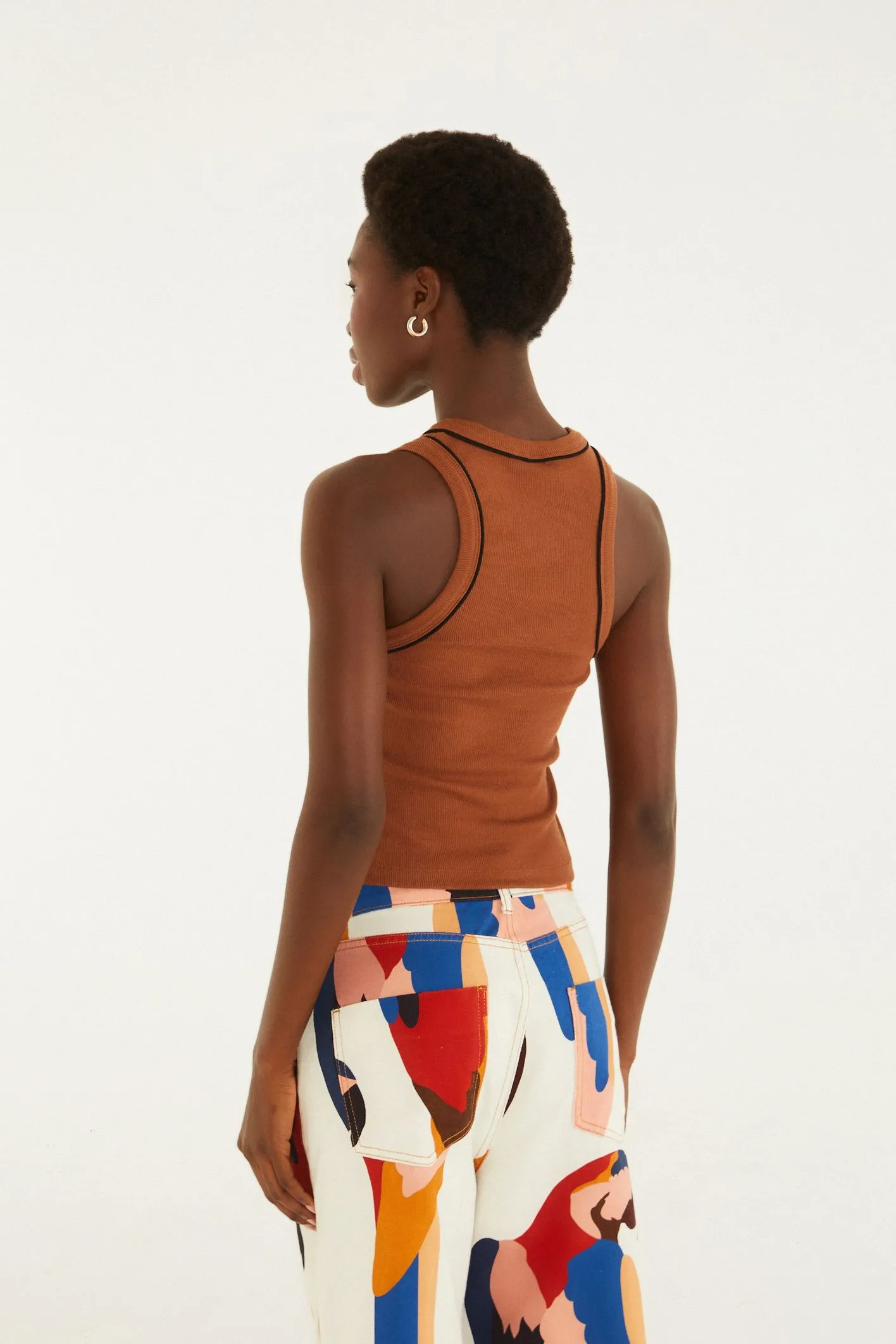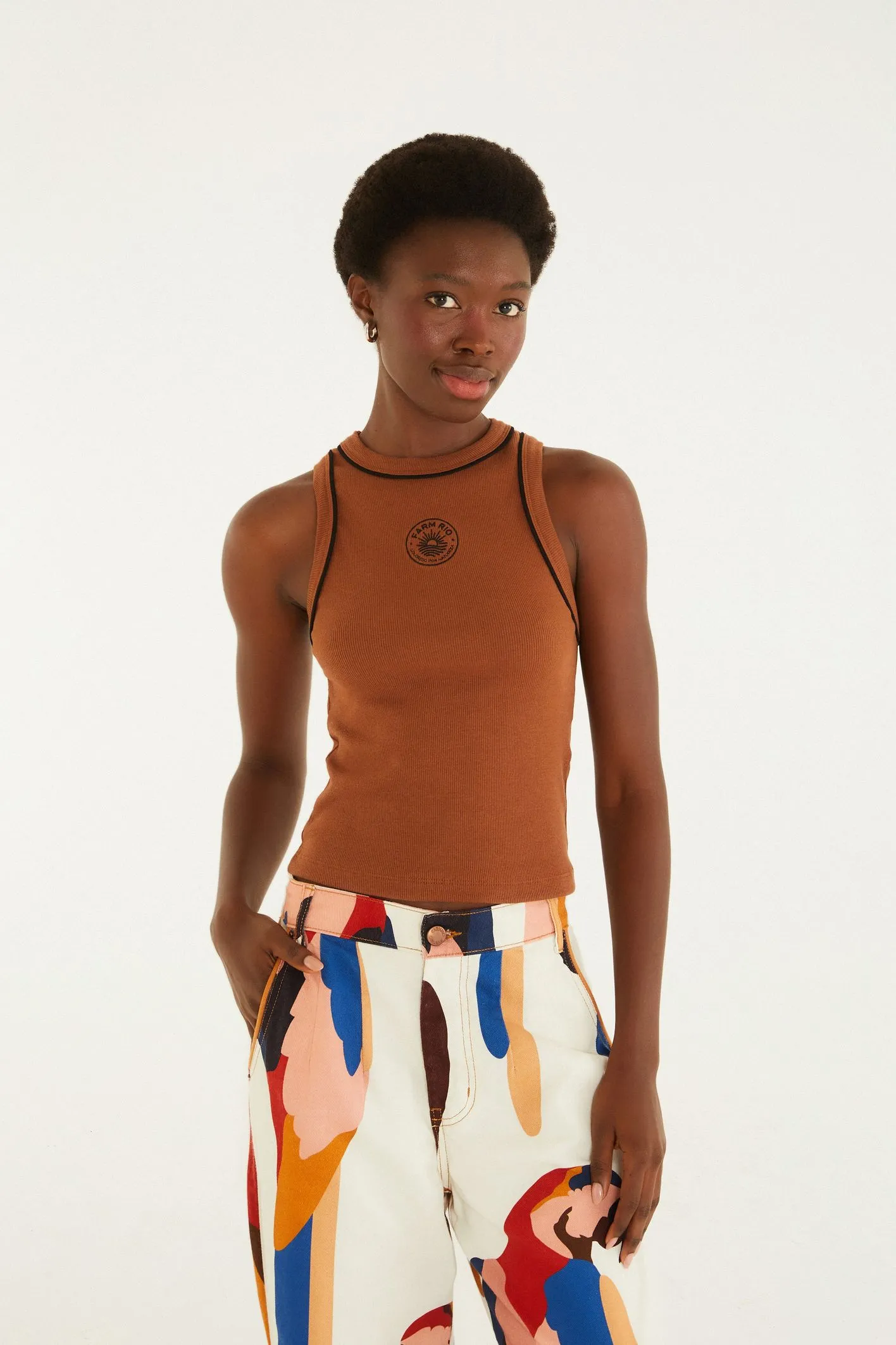 regata bicolor bordada sol da FARM é um toque de autenticidade para seu guarda-roupa. com alças largas e gola alta, ela é perfeita para dias casuais ou saídas descontraídas. o bordado delicado eleva seu visual, tornando-se um destaque em qualquer ocasião. FARM Rio, coleção Carioca – inverno 26.