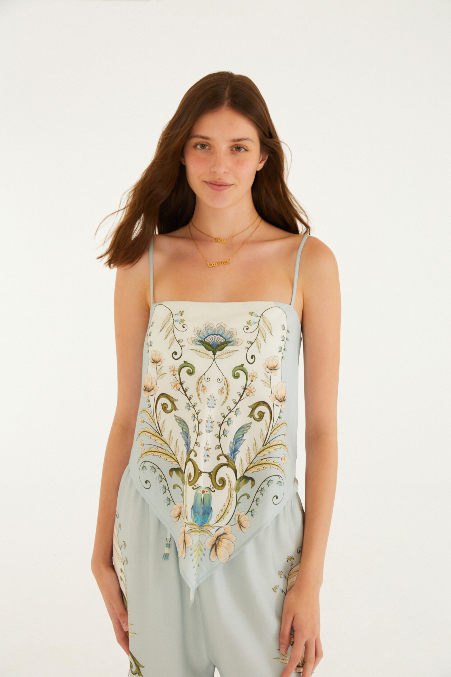 Alças Finas: Possui alças delicadas estilo “espaguete”, que reforçam a proposta de uma peça fresca e minimalista na parte superior.