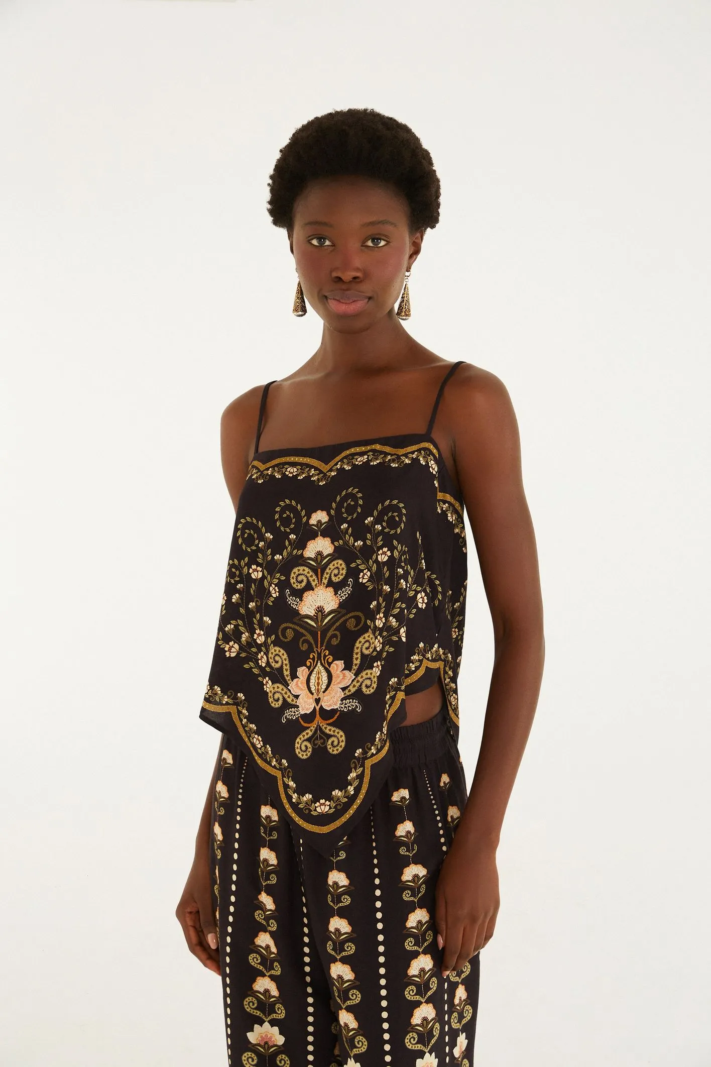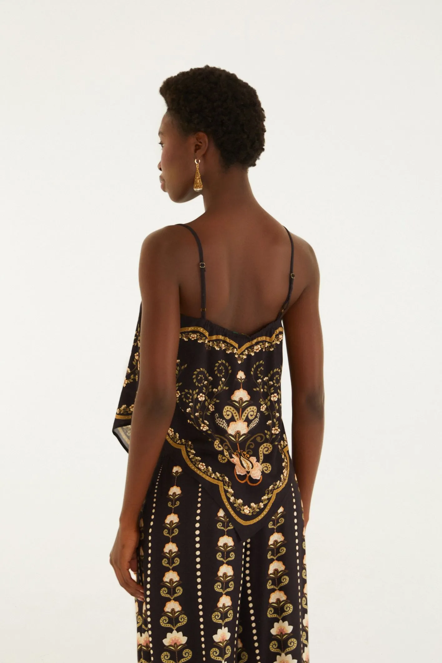 regata nikita. com alças finas e um corte solto, proporciona conforto e frescor para os dias mais quentes. seu design detalhado e cortes assimétricos elevam a originalidade da peça, perfeita para encontros casuais ou jantares ao ar livre. uma escolha versátil e cheia de personalidade. FARM Rio, coleção Carioca – inverno 26.