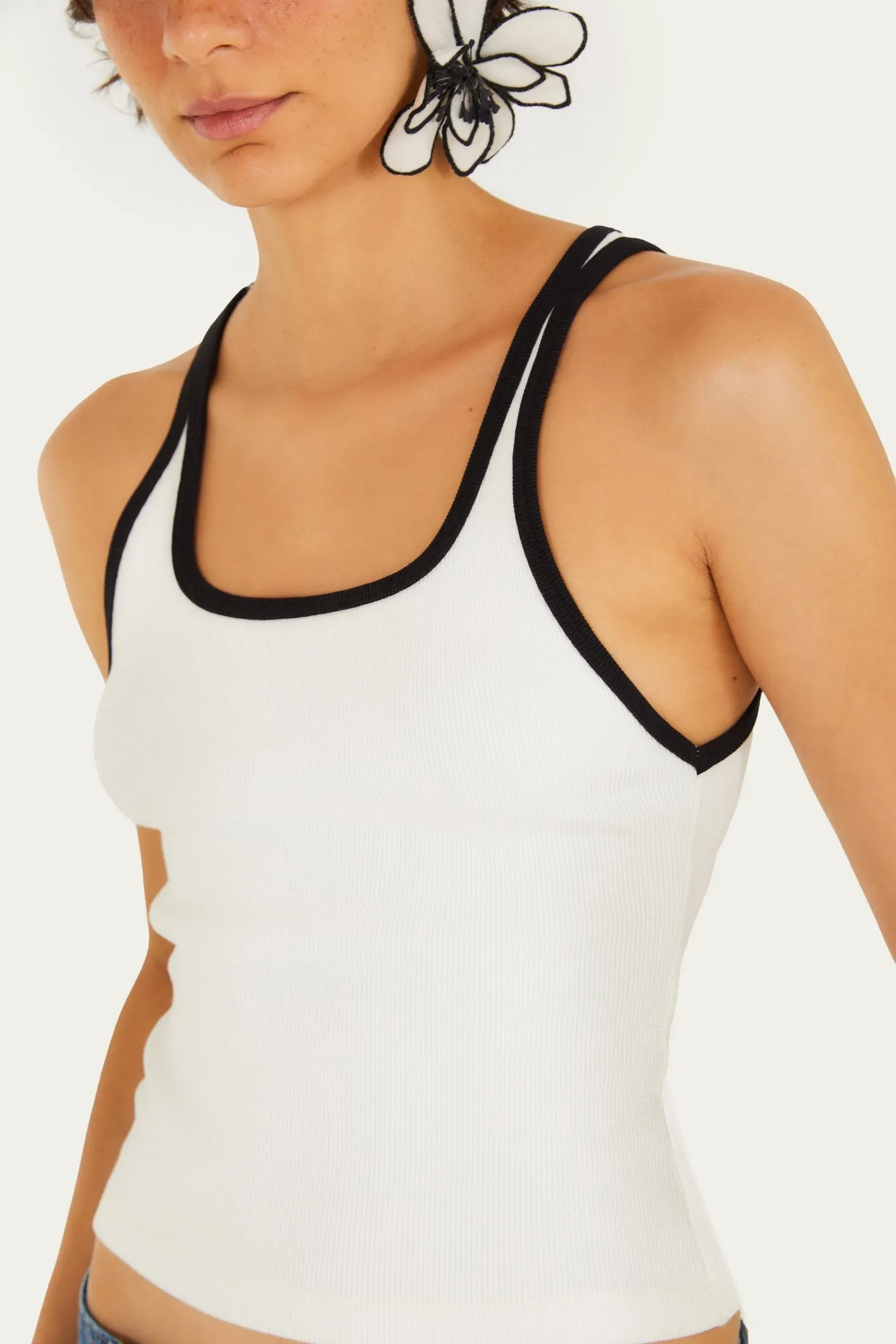 regata nina bicolor. apresenta um design moderno com alças finas e recorte reto que valoriza o busto. o contraste de cores traz um toque autêntico e versátil, ideal para um look casual ou para combinações mais elaboradas. confeccionada em tecido leve e confortável, é perfeita para dias ensolarados e momentos especiais. FARM RIO original – verão 26.