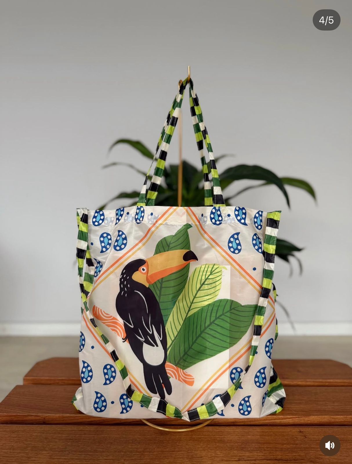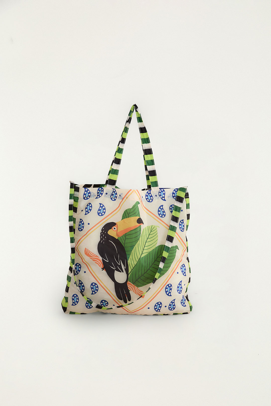A bolsinha “Me Leva Bossa Tucano Lenço” é uma pequena bolsa (bolsinha) artesanal com alças listradas nas cores verde, preto e branco. O corpo da bolsa é tecido branco decorado com pequenas flores azuis e apresenta, no centro, um desenho de um tucano (pássaro) pousado sobre folhas verdes e uma laranja, emoldurado por um losango laranja com detalhes florais azuis nas bordas. O design remete a um estilo étnico e colorido, inspirado na natureza.