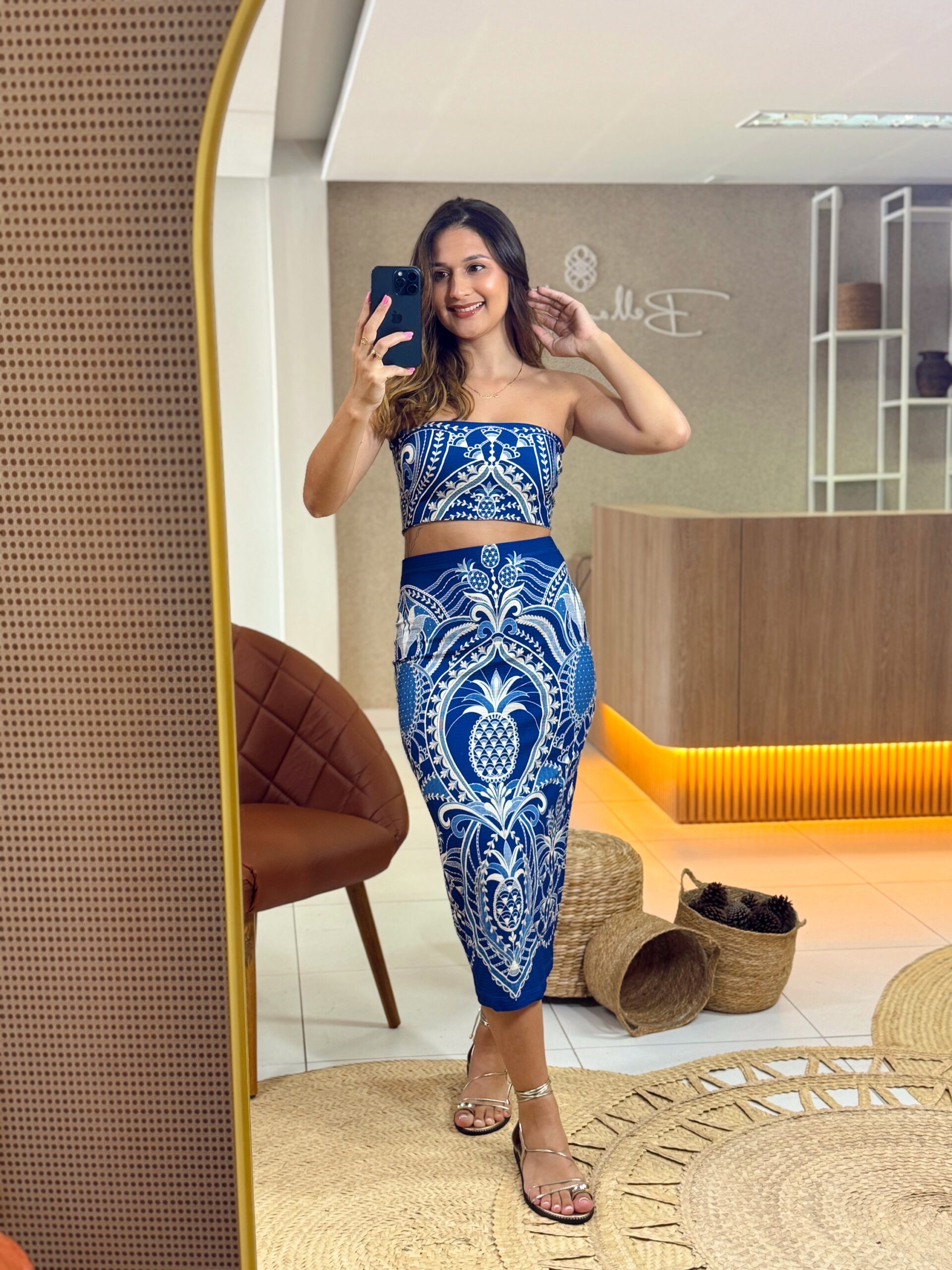 saia midi reta primor de abacaxi é a escolha perfeita para momentos casuais ou eventos especiais. com um corte reto elegante, essa peça traz um caimento confortável e moderno. sua estampa exclusiva adiciona um toque de alegria e autenticidade ao look. combine com tops variados para passeios de dia ou jantares à noite. FARM Rio, coleção Carioca – inverno 26.