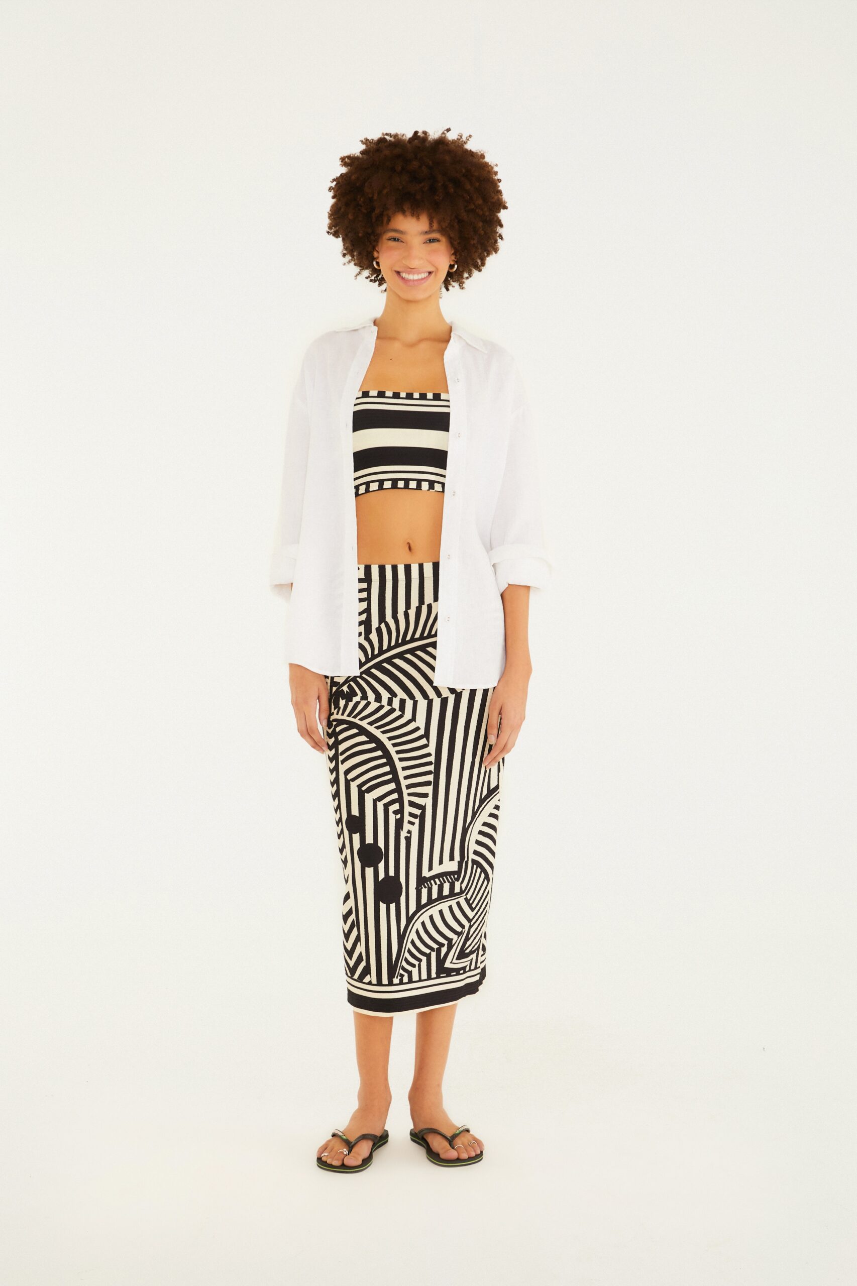 saia midi reta listra tropical. com design atemporal e corte reto, a peça é ideal para um look versátil. seu comprimento midi permite combinações tanto para o dia a dia quanto para eventos casual chic. confeccionada em tecido leve, oferece conforto e um toque de originalidade. a estampa listrada garante um visual moderno e elegante. FARM Rio, coleção Carioca – inverno 26.