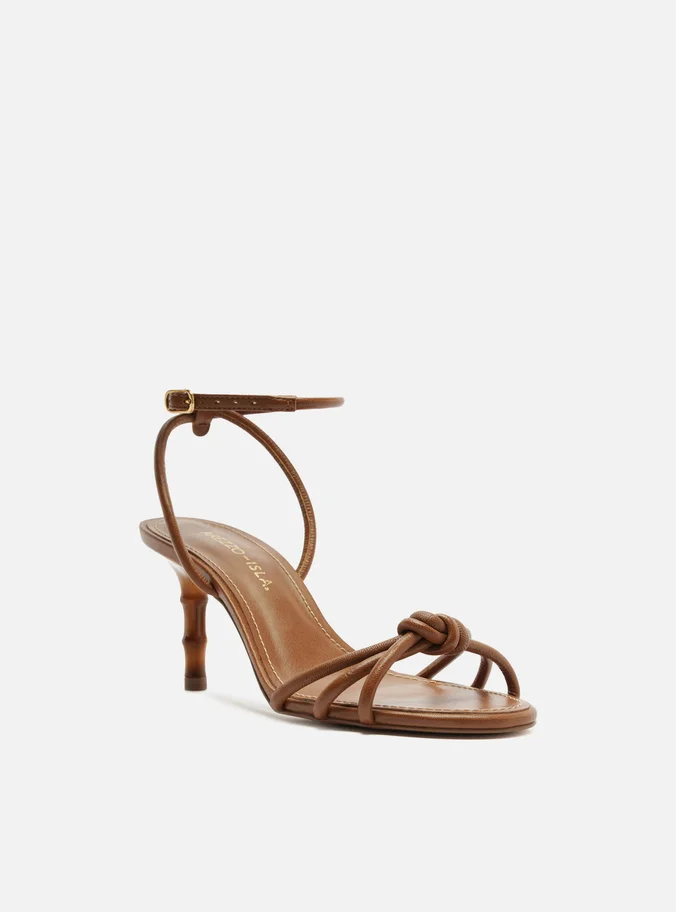Sandália feminina marrom. O sapato tem salto médio fino, em acrílico tartaruga e forma de bambu, e formato arredondado na ponta. Traz tiras finas e unidas por nó sobre os dedos. Possui tira fina que sai das laterais, cruza no calcanhar, contorna o tornozelo e fecha em fivela lateral. Com palmilha da cor da sandália e inscrição do nome da marca.