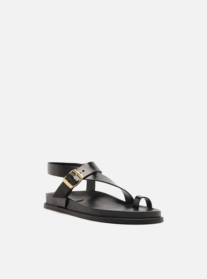 Sandália rasteira feminina preta com acabamento envernizado. O sapato tem palmilha lisa com formato anatômico e gravação do nome da marca. Possui solado flatform, base emborrachada e formato arredondado na ponta. Traz tira média que cruza a parte superior do pé, contorna o calcanhar e vai até a outra lateral, fechando em fivela metálica dourada, além de tira fina em torno do dedão.