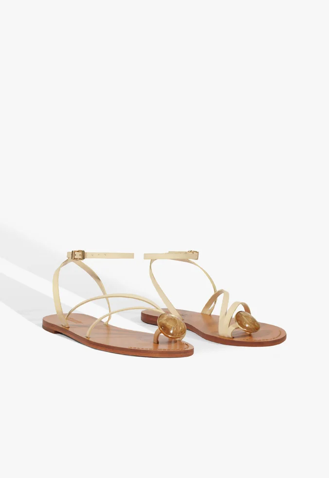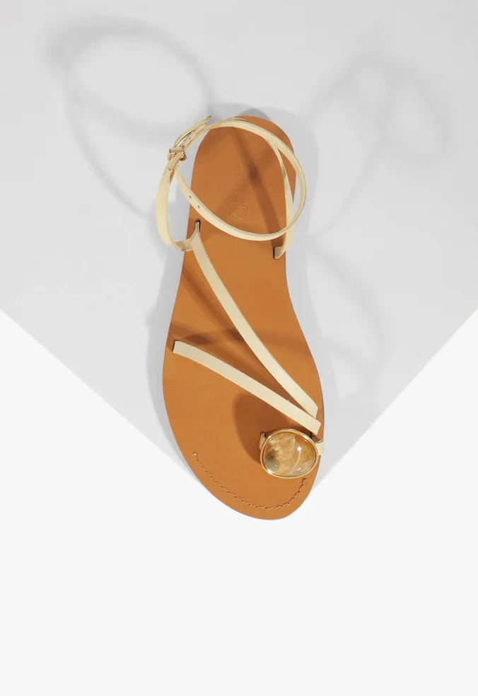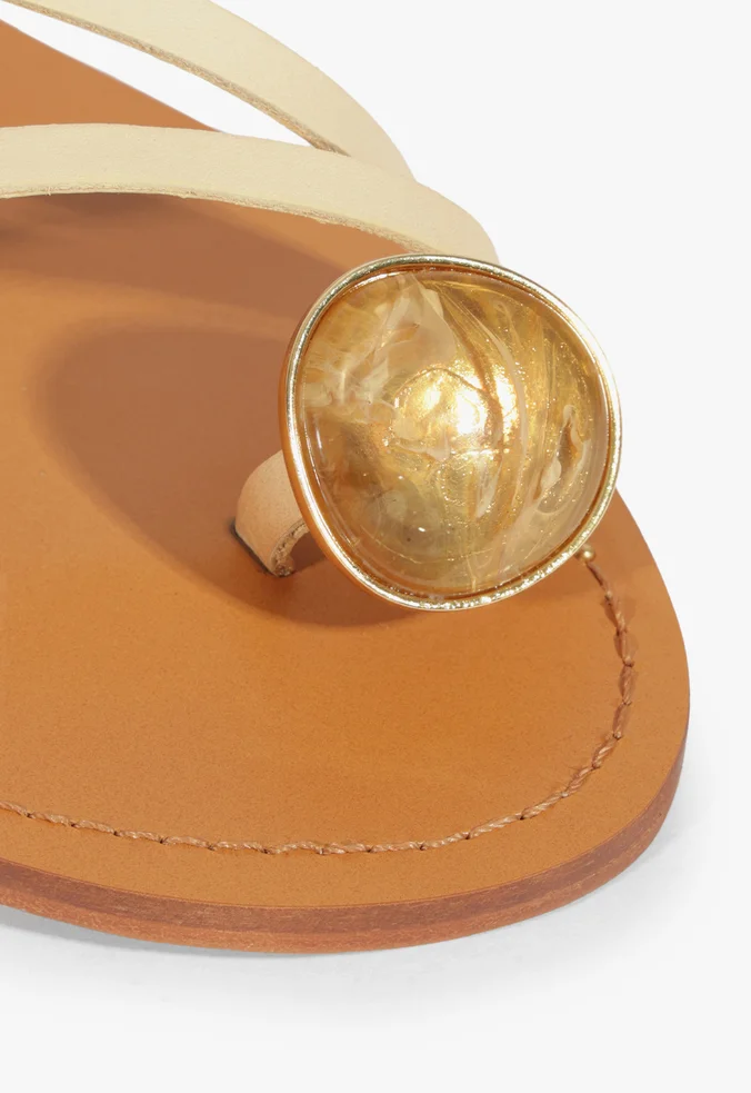 Sandália rasteira em couro, com cabedal composto por tira fina sobre os dedos e outra em diagonal no peito do pé, unidas por detalhe com studs de pedra. Possui fechamento por fivela ajustável no tornozelo.