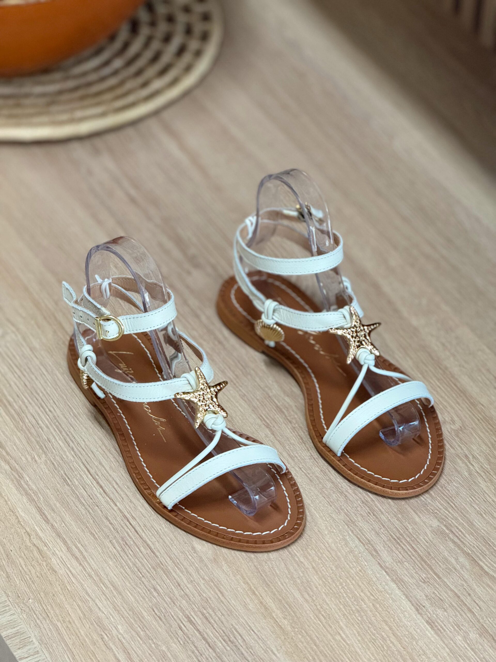 Inspirada no estilo leve do verão, a rasteira evoca a delicadeza e sofisticação para a estação mais quente do ano. Produzida em couro no tom branco, possui aviamento central em formato de estrela e duas conchas laterais, solado em couro com acabamento pespontado e fivela de ajuste no tornozelo