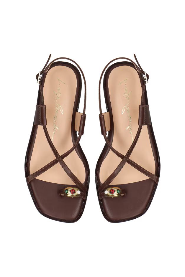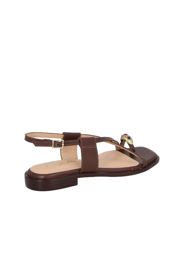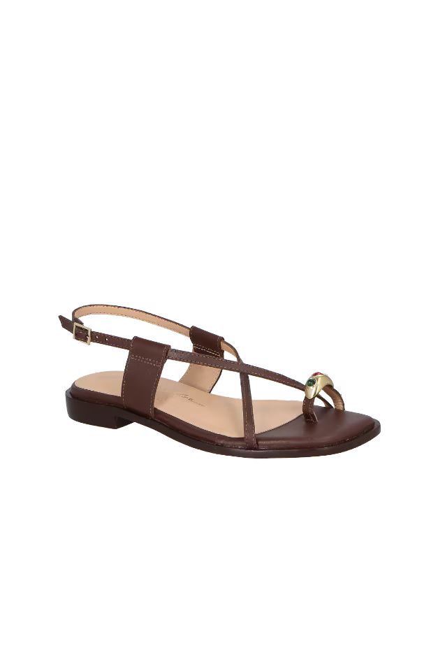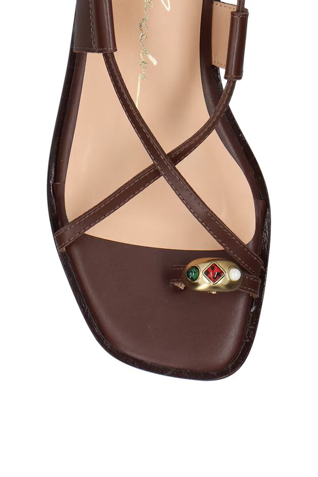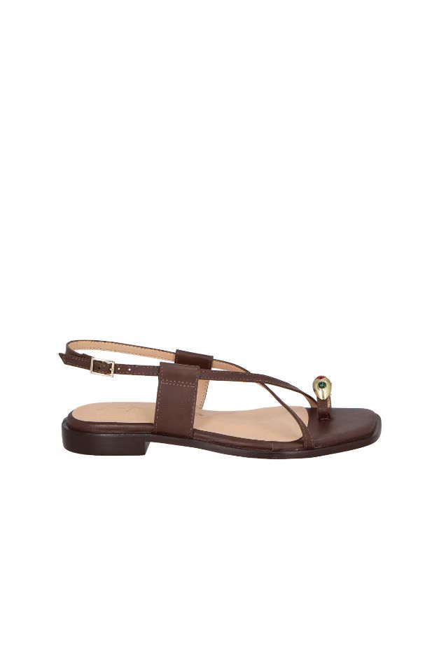 Com desenho orgânico que remete à joalheria, o anel metálico cravejado com gemas em tons preciosos ganha protagonismo. A sandália se revela como uma verdadeira joia de verão. O modelo é produzido em couro no tom marrom café, possui vira saliente que se estende por todo contorno da sandália, enfeite metálicos e fechamento por fivela com ajuste no tornozelo.