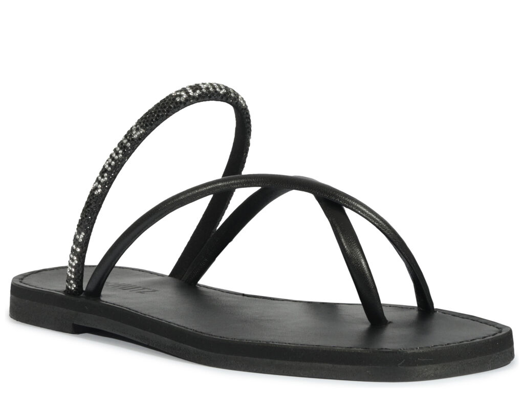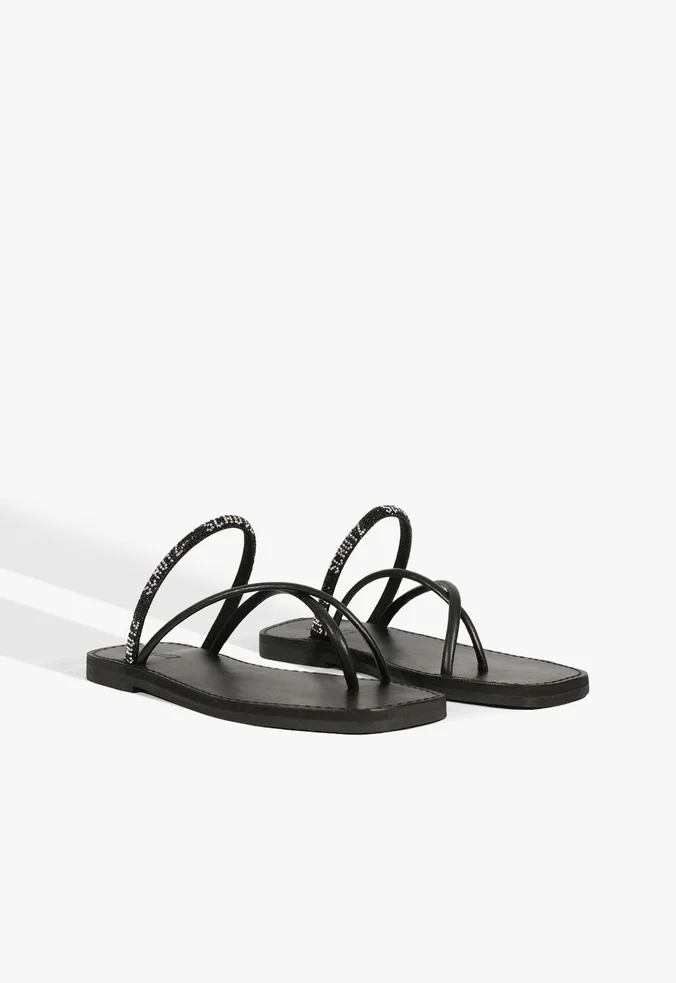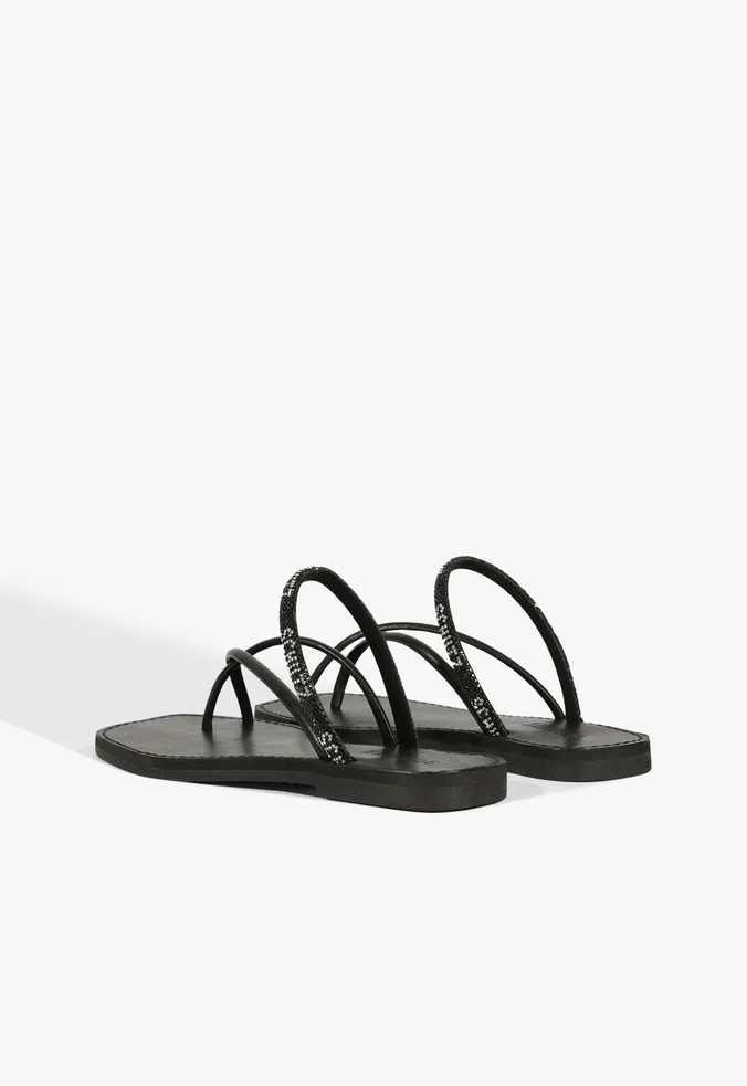 Aposte na elegância descomplicada. Esta sandália rasteira preta é a peça-chave para um visual moderno e versátil. O design de tiras finas e o detalhe em strass no peito do pé trazem um toque de sofisticação e brilho. Perfeita para te acompanhar do dia à noite com muito conforto e estilo.