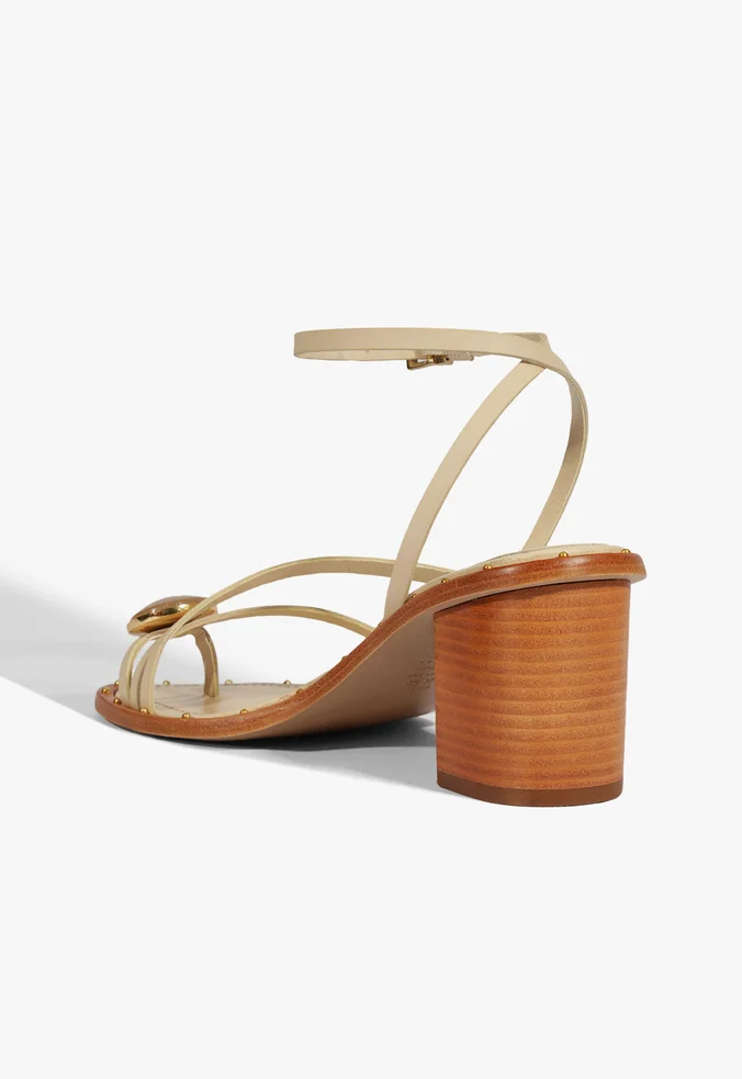 Sandália em couro, com cabedal composto por tira fina sobre os dedos e outra em diagonal no peito do pé, unidas por detalhe com studs de pedra, com detalhe de mini studs dourados ao redor da sola. Possui fechamento por fivela ajustável e salto médio bloco.