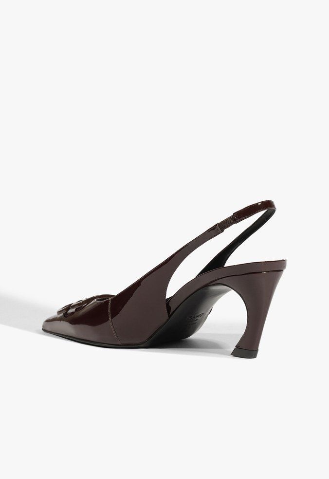 Esse slingback em couro com acabamento verniz é puro poder! O salto curvado de altura média dá aquele toque sexy sem abrir mão do conforto, enquanto o bico fino e o recorte em V adicionam um visual refinado e descolado. É a escolha ideal para quem quer se destacar com um look moderno e irresistível.