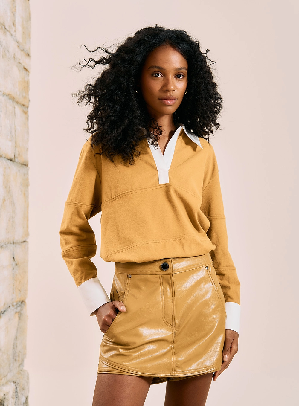 • Acessórios dourados complementam perfeitamente o tom mostarda da peça.