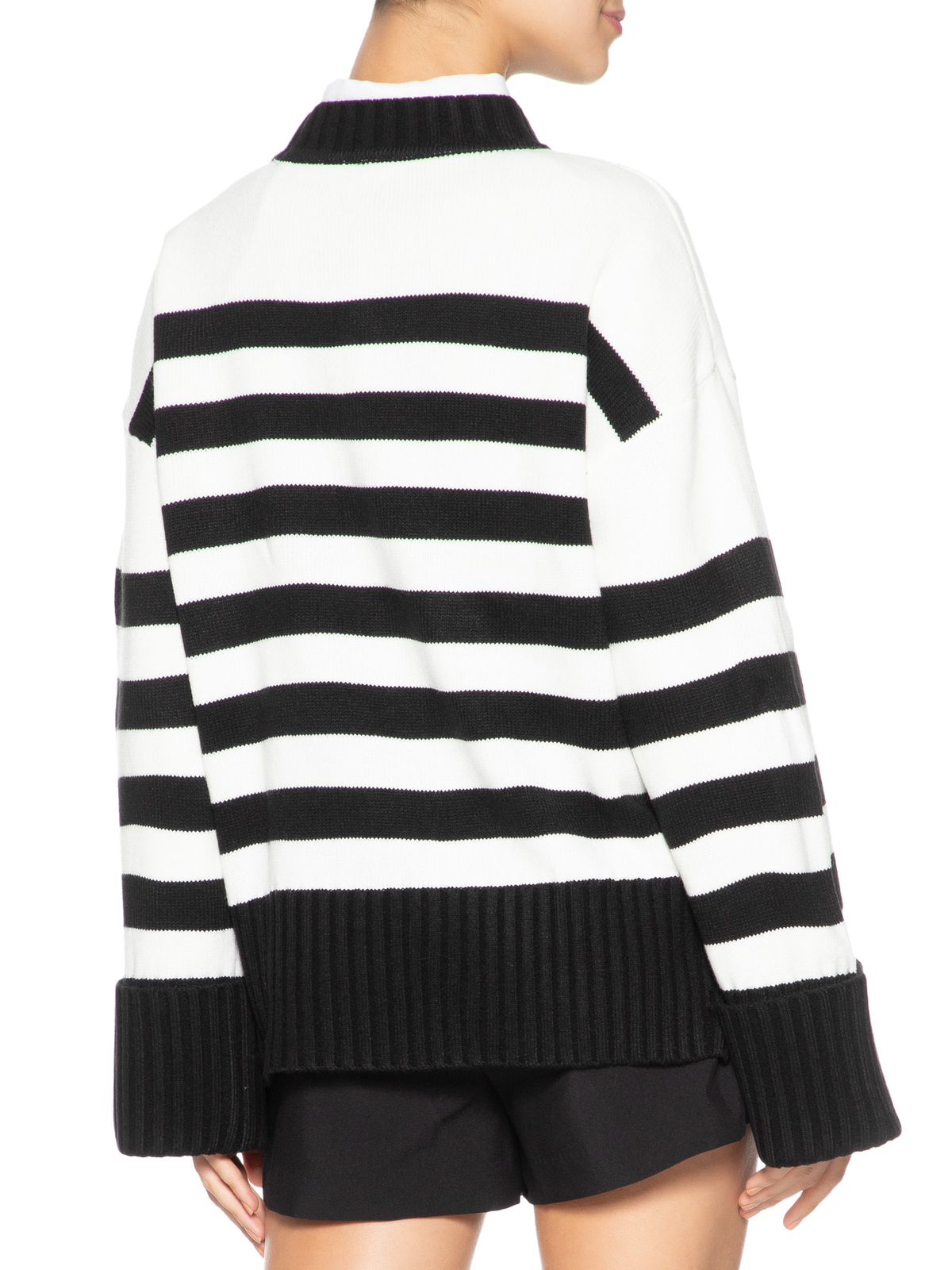 O suéter preto é confeccionado em tricot com baixa elasticidade. A peça solta ao corpo possui gola alta, mangas longas, ombros estendidos, bordado figurativo aplicado em cores contrastantes na parte frontal e padronagem listrada em cor contrastante.