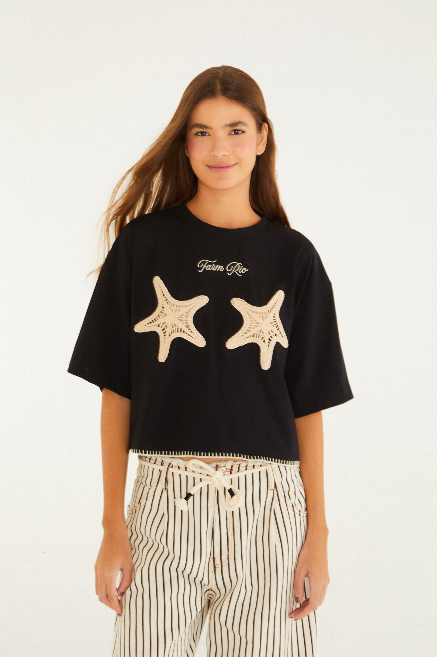 t-shirt estrela do mar farm rio. com um design casual e moderno, a t-shirt traz mangas curtas amplas e detalhes bordados de estrela do mar. o corte solto proporciona conforto e estilo, perfeita para um passeio à beira-mar ou um encontro. detalhes contrastantes nas bordas elevam o visual.