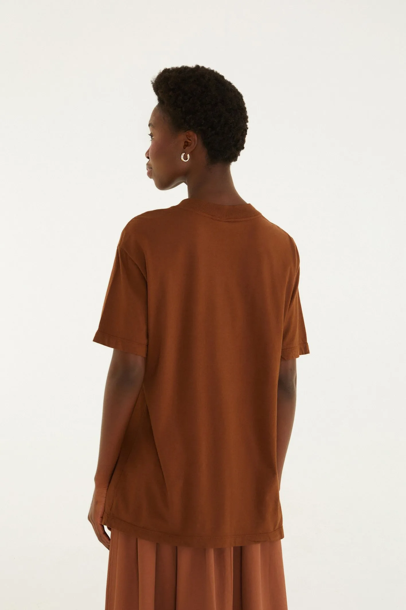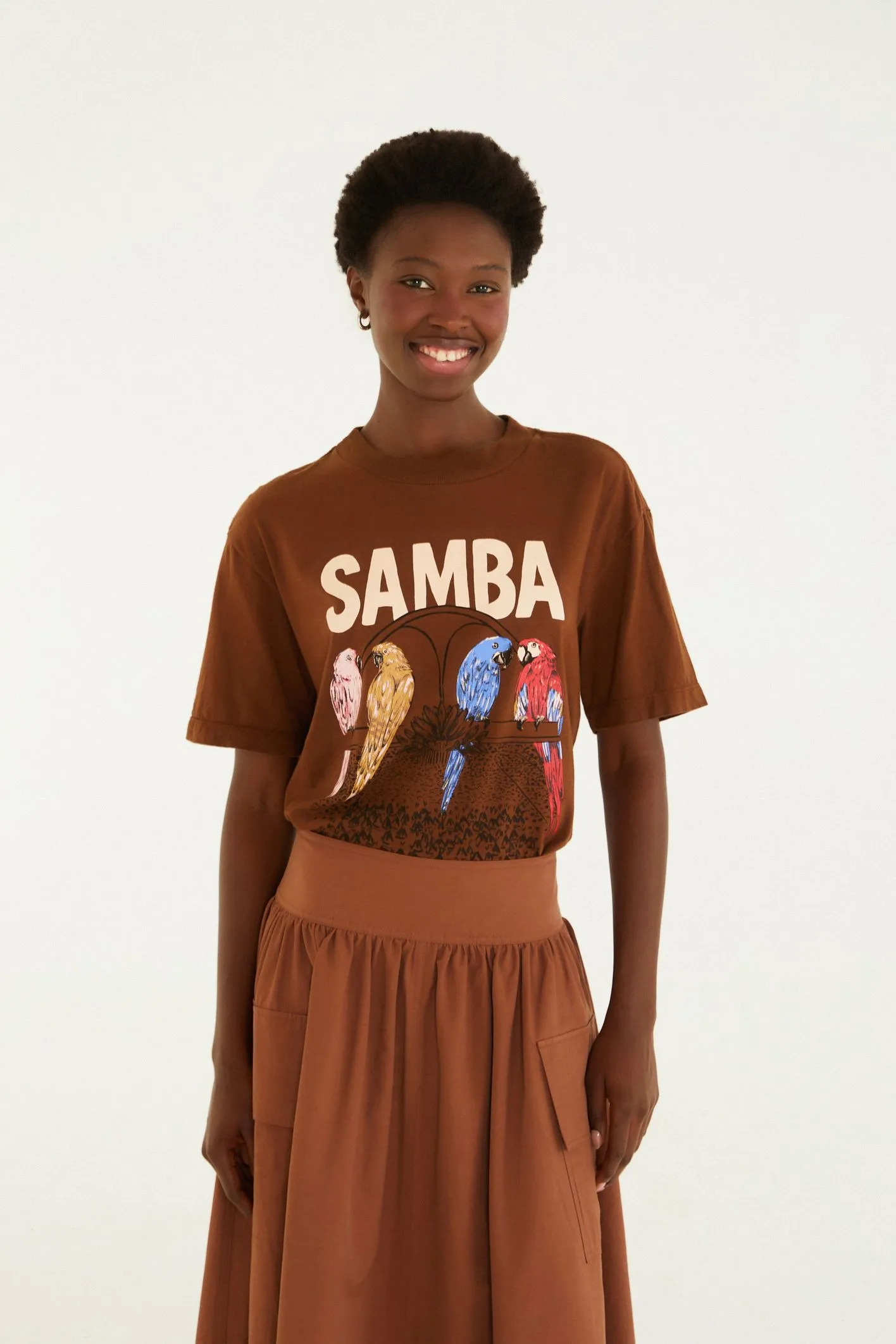 t-shirt media na avenida marrom. com um toque casual e descontraído, esta peça valoriza o conforto e a criatividade, ideal para momentos descomplicados. as mangas curtas e o corte solto garantem liberdade de movimento, enquanto o estilo único traz um charme autêntico para qualquer look. perfeita para combinar com saias, shorts ou calças em diversas ocasiões. FARM Rio, coleção Carioca – inverno 26.