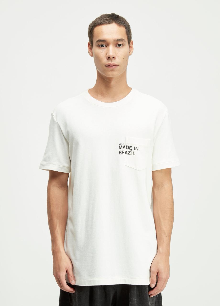 A camiseta da Osklen mostrada na imagem apresenta um estilo moderno, minimalista e urbano, típico da identidade da marca.