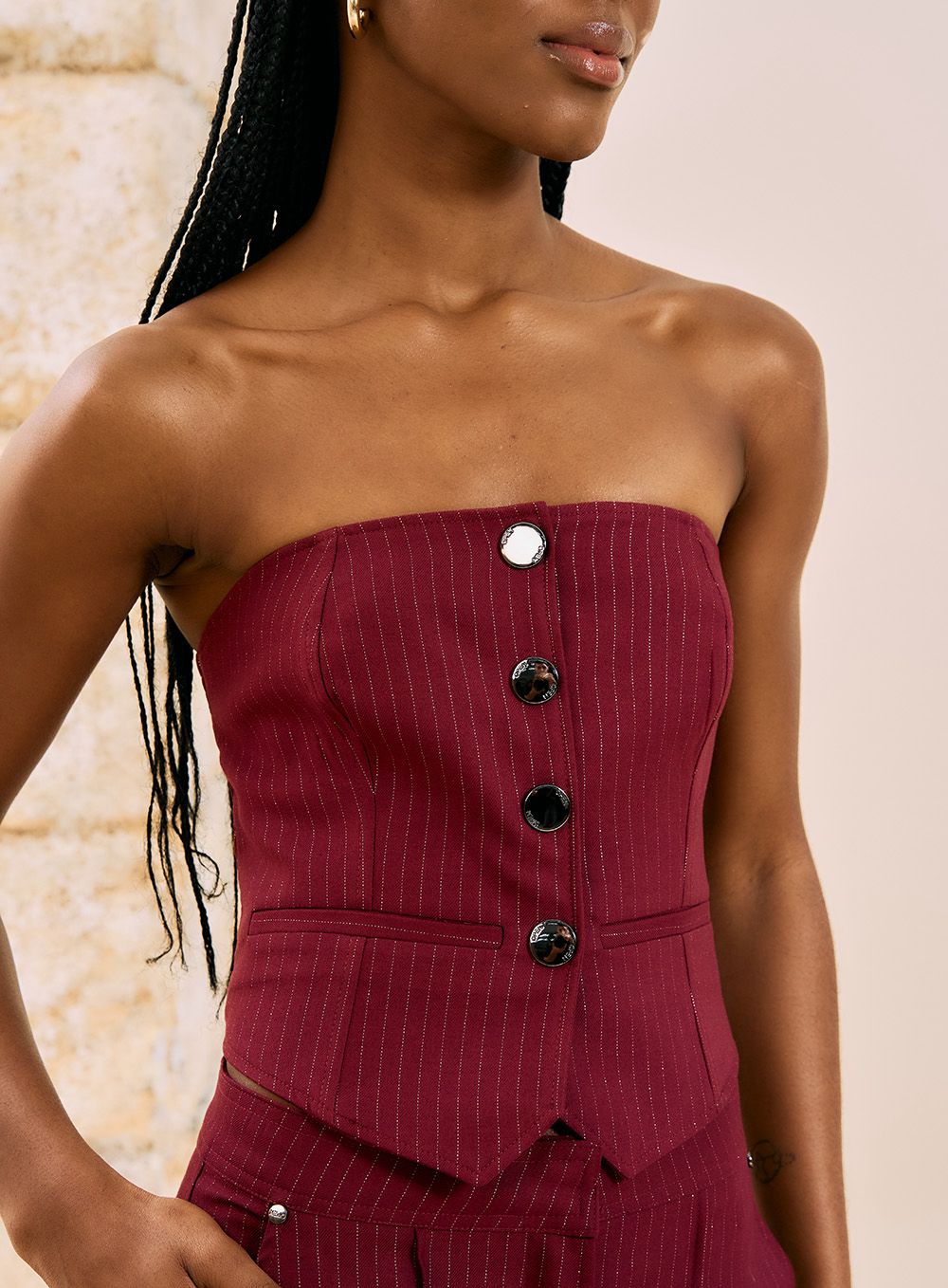 Funcionalidade: Estrutura interna que garante sustentação (tomara que caia seguro) com elegância de alfaiataria DICAS TEAM OPEN ! Combine com a calça pantalona risca de giz coordenada para um conjunto de alfaiataria moderno e poderoso.