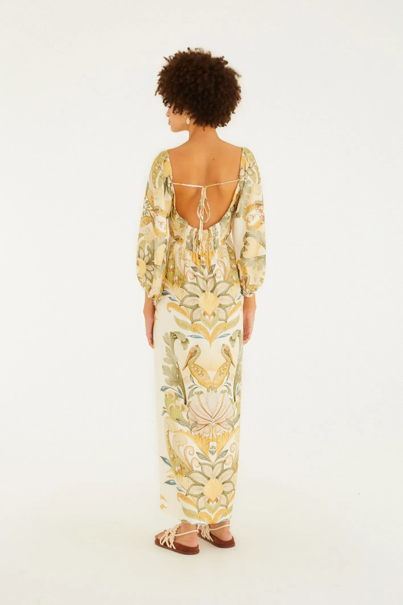 vestido cropped jardim de mar. possui decote profundo com detalhe vazado, mangas 3/4 bufantes e fenda lateral. confeccionado em tecido fluido, proporciona leveza e movimento. ideal para momentos casuais e ocasiões especiais, garantindo um toque único a cada look. FARM Rio, coleção Carioca – inverno 26.
