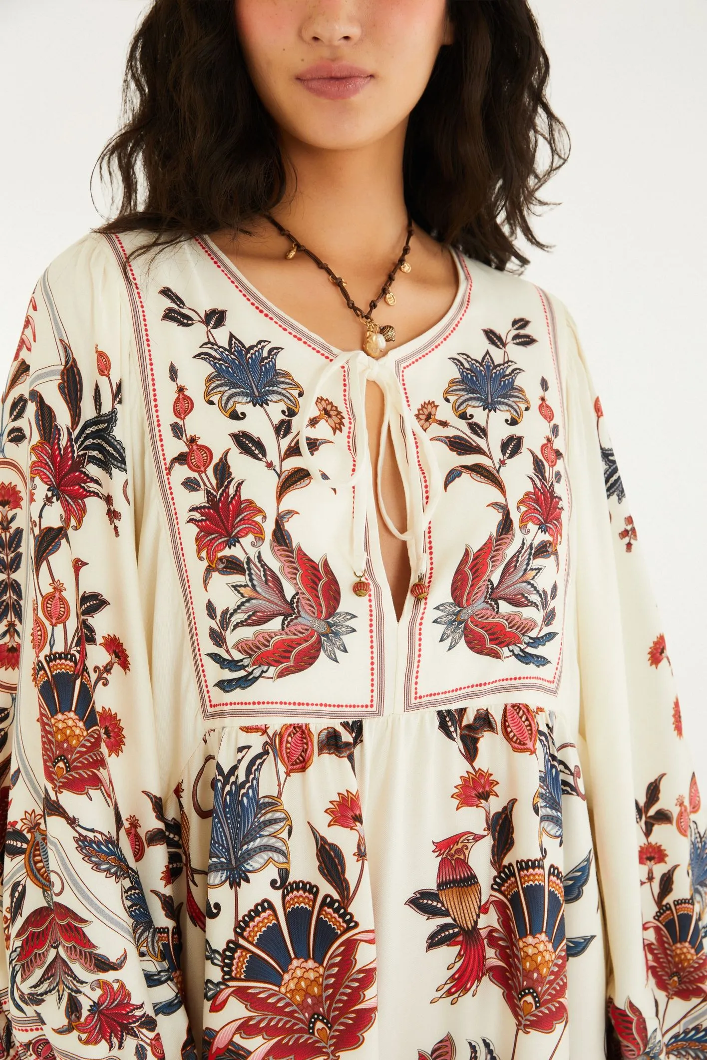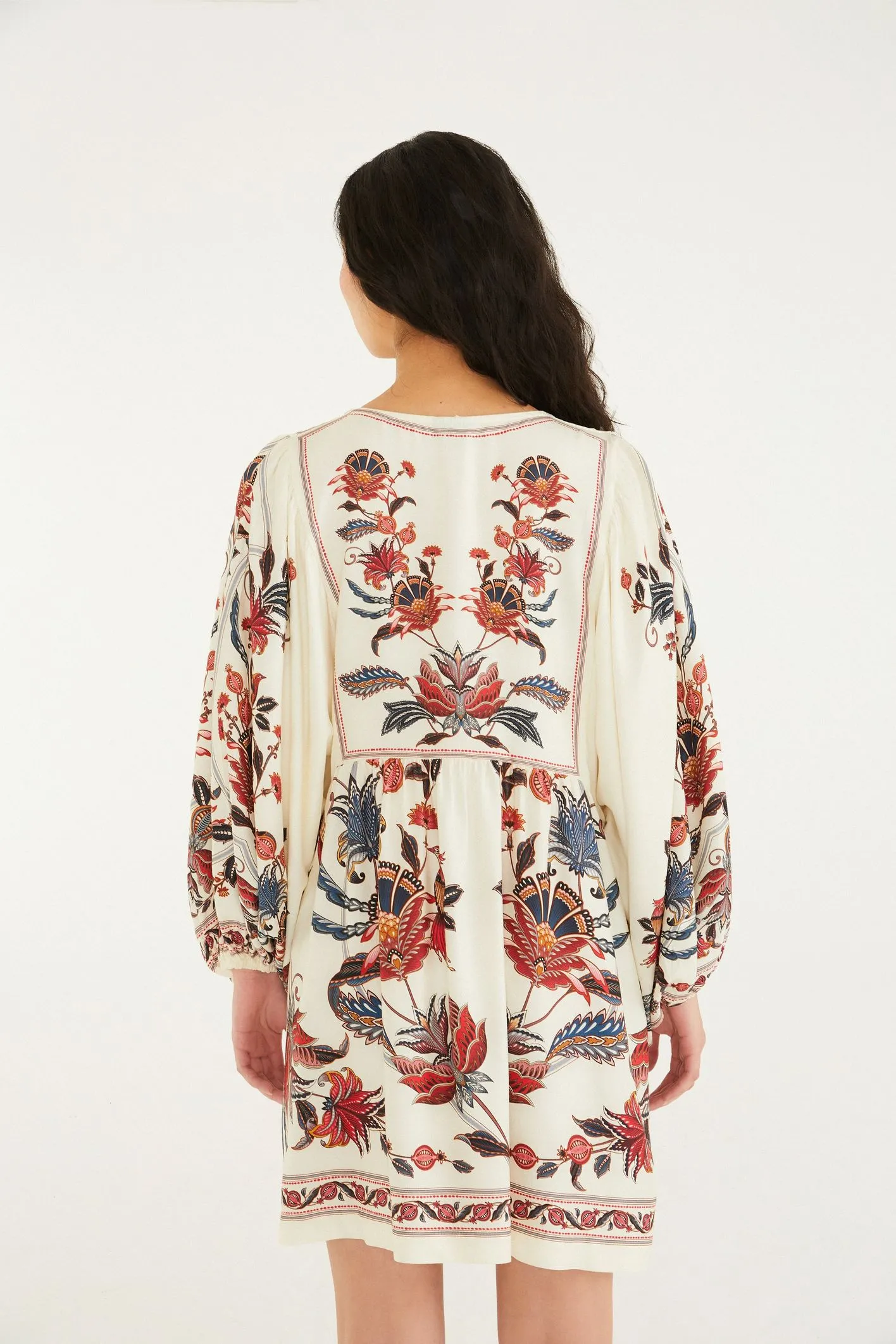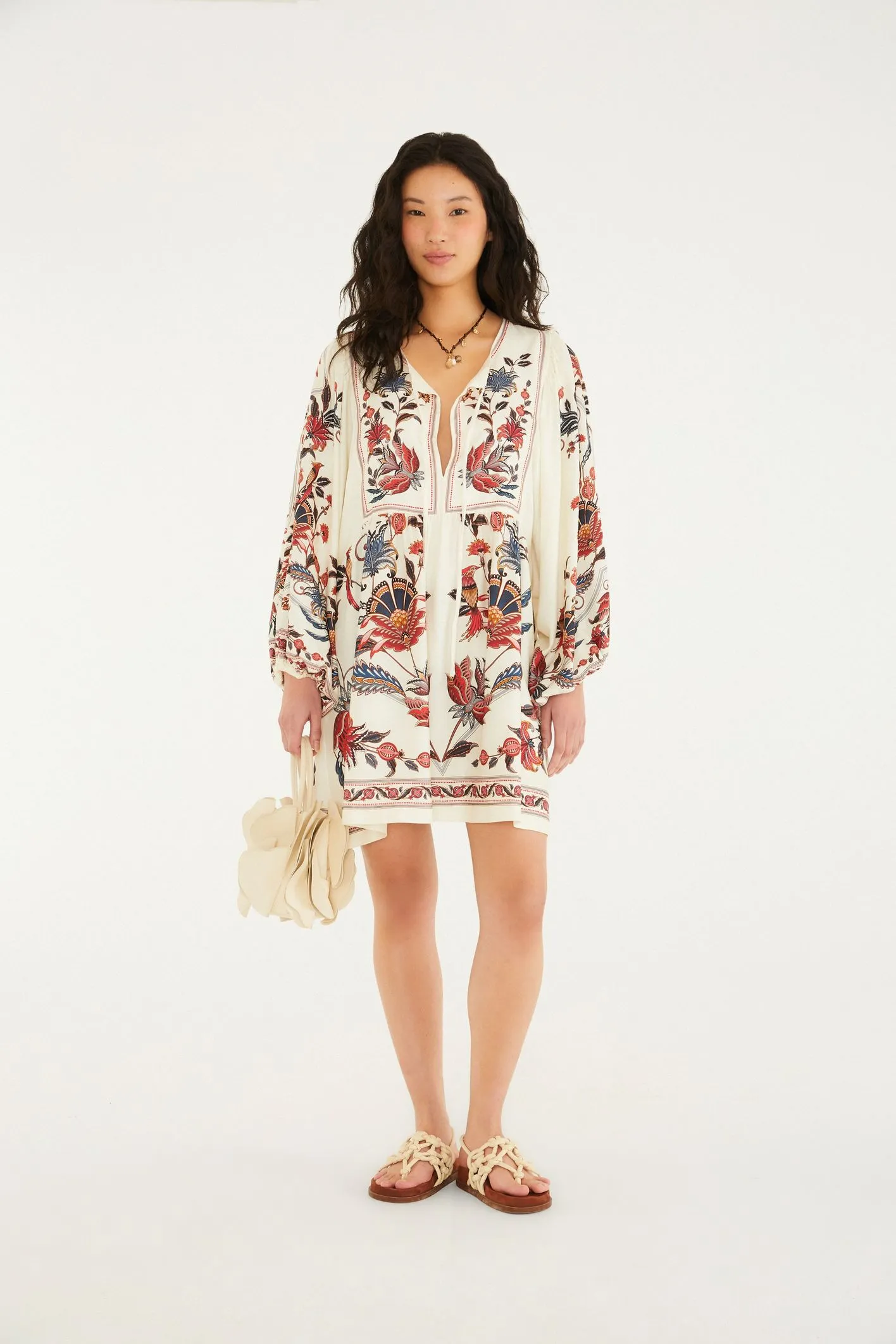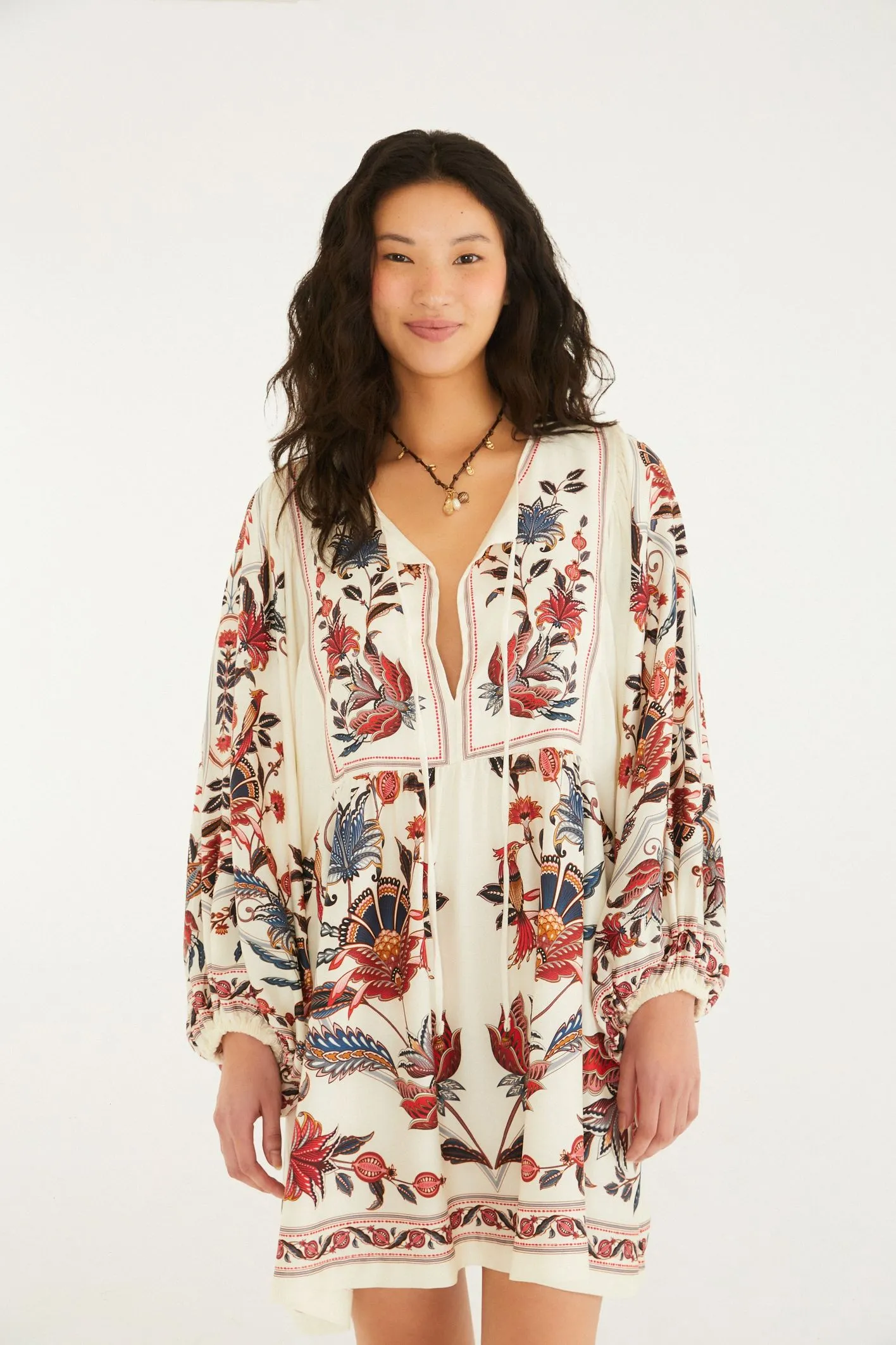 vestido curto bohoflor. confeccionado em tecido leve, possui decote redondo com amarração delicada no busto. as mangas amplas e levemente bufantes conferem um toque boêmio, enquanto a modelagem solta garante conforto e estilo casual perfeito para um passeio ou encontro relaxante. FARM Rio, coleção Carioca – inverno 26.