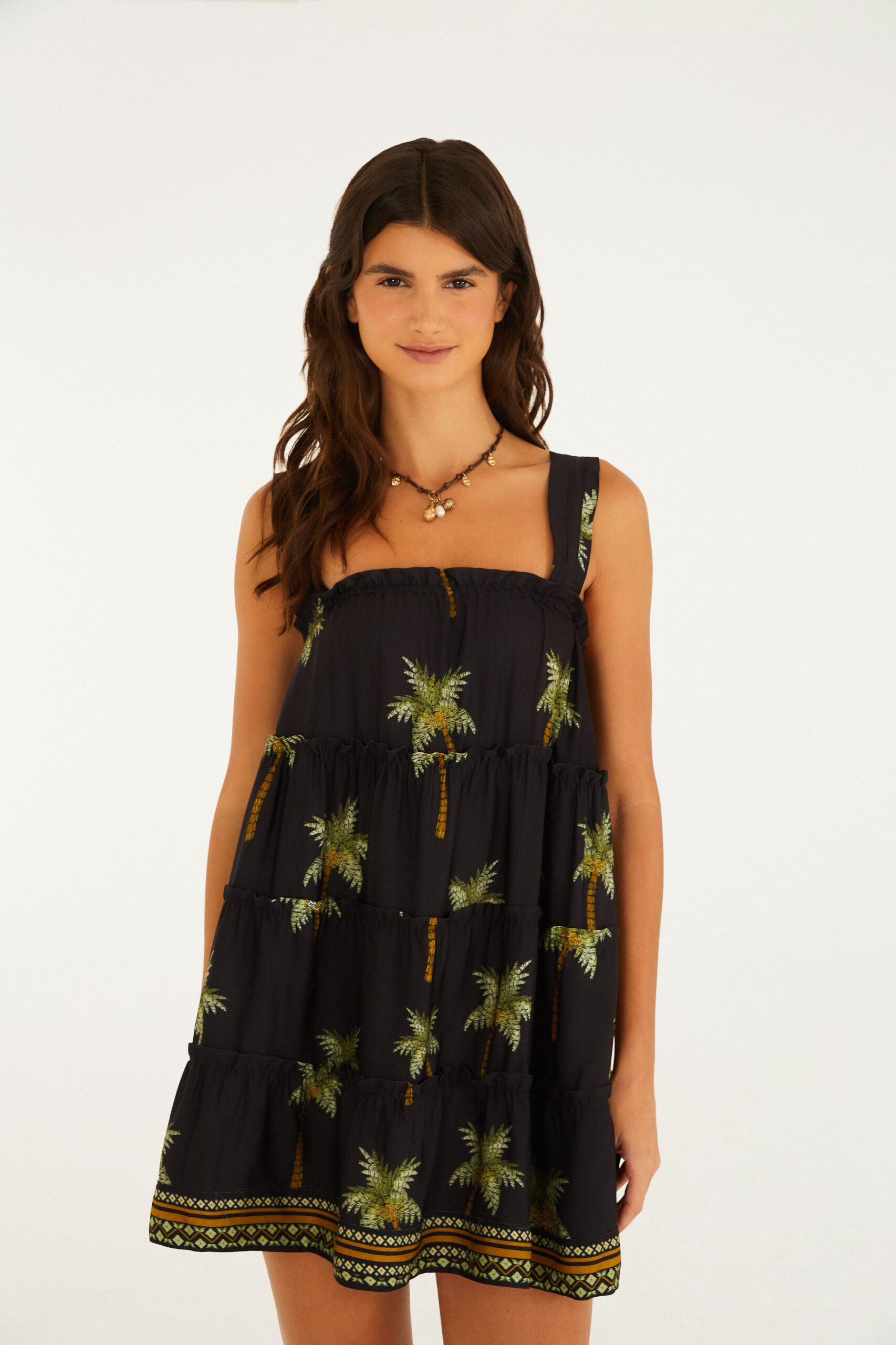 vestido curto coqueiritos preto. possui decote reto encantador com alças largas e detalhe franzido no busto. a leveza dos babados cria um movimento único, ideal para um passeio casual ou evento especial. confeccionado em viscose, proporciona conforto e frescor. a estampa tropical traz um toque de originalidade aos dias mais frios. FARM Rio, coleção Carioca – inverno 26.