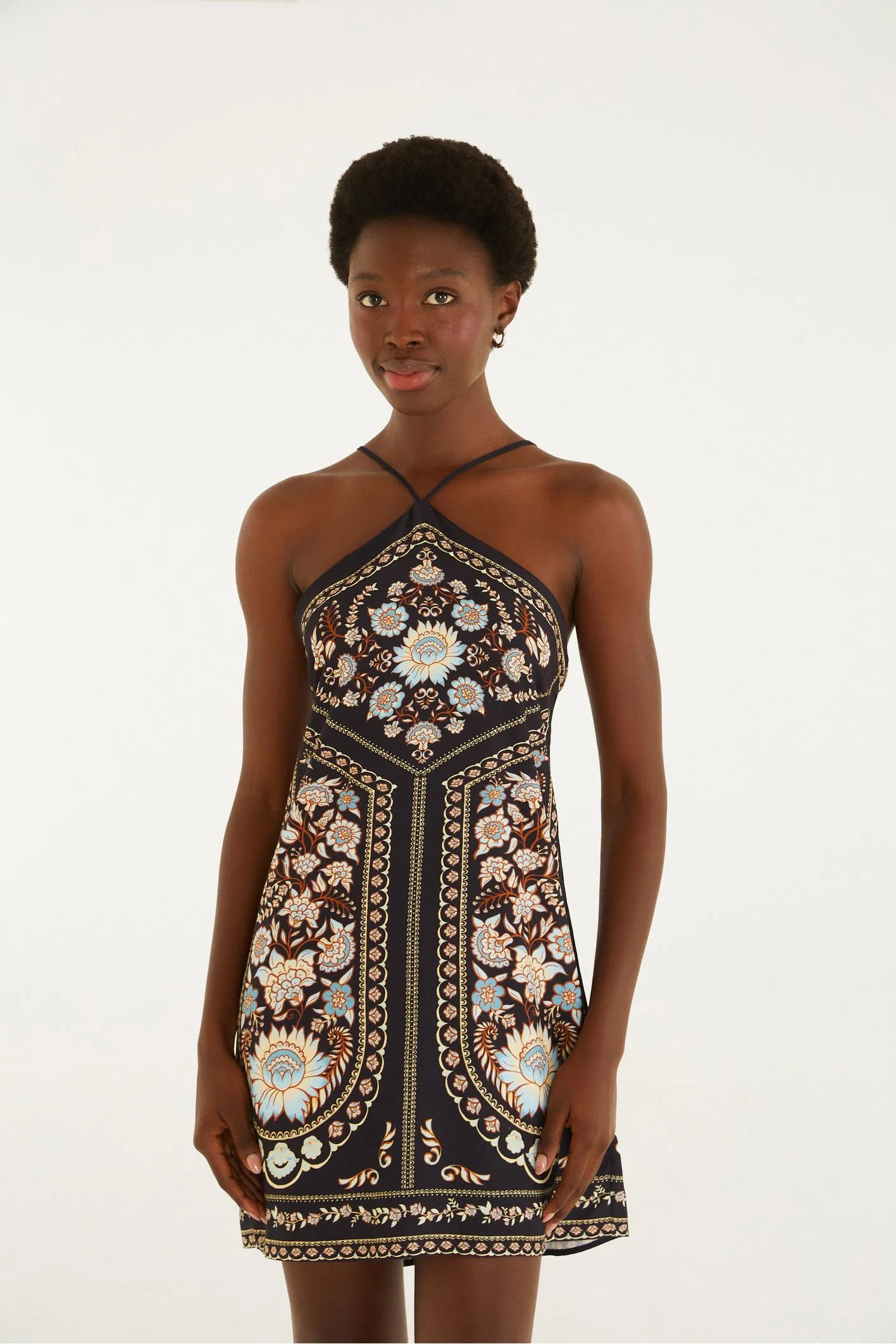 vestido curto daniela traz alças finas que se entrelaçam nas costas, adicionando um charme especial ao look. o decote reto e sem alças oferece um visual contemporâneo e casual, perfeito para dias de passeio ou eventos ao ar livre. a modelagem solta garante conforto sem perder o estilo. FARM Rio, coleção Carioca – inverno 26.