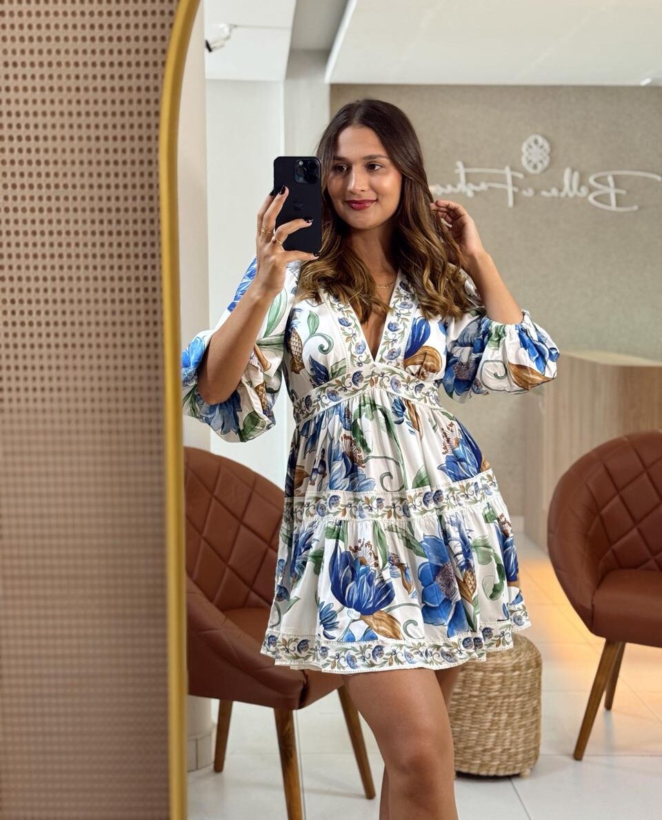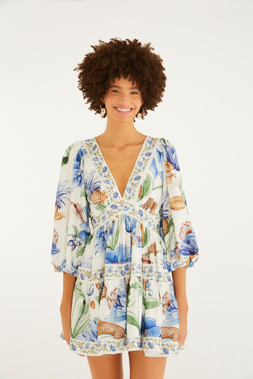 vestido curto floral elsa. com um decote profundo em v e mangas volumosas, esta peça traz leveza e movimento. a cintura é delicadamente marcada, criando um caimento suave. perfeito para um almoço casual ou um passeio ao ar livre, ele combina conforto e originalidade. FARM Rio, coleção Carioca – inverno 26.