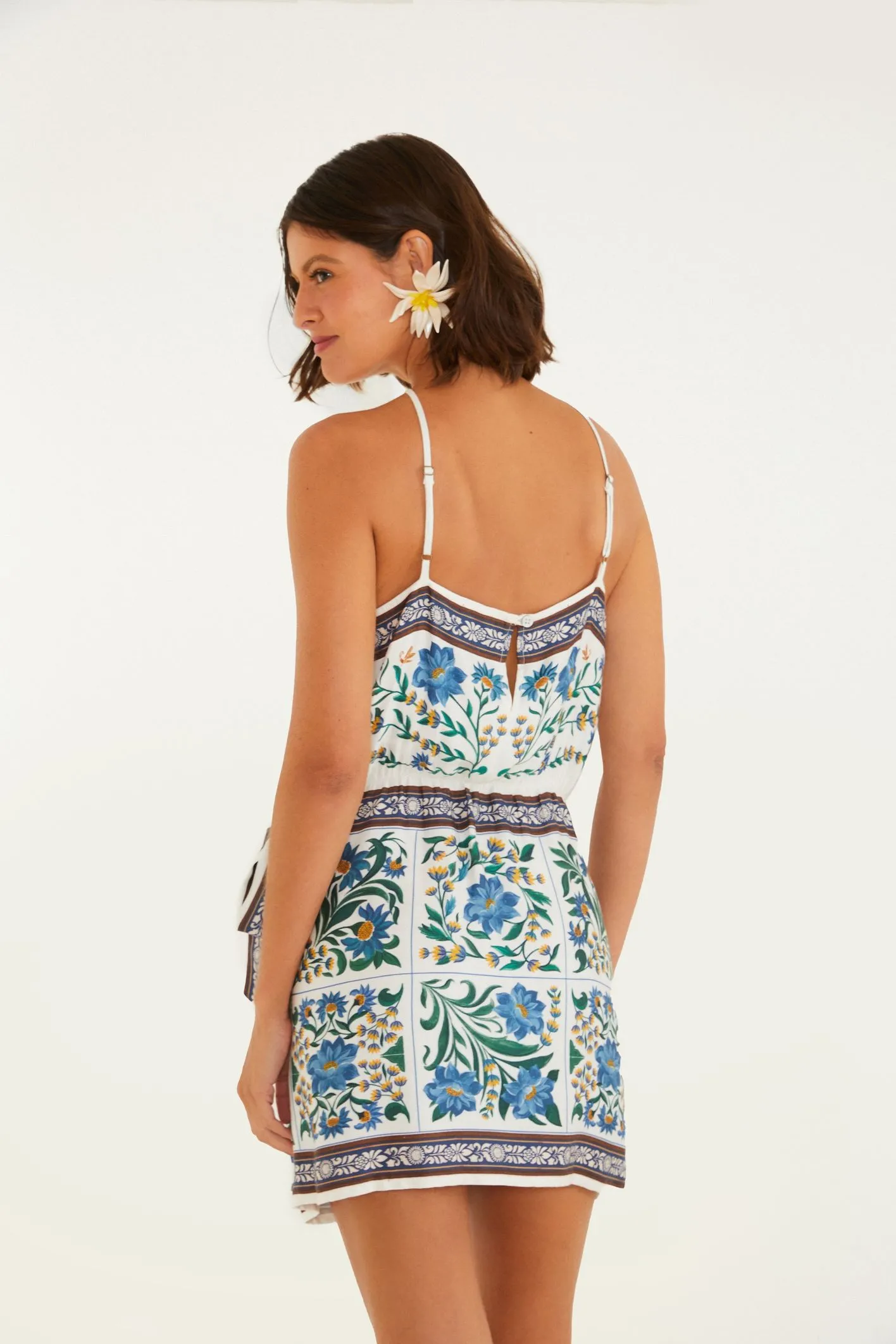 vestido curto estampado manoela. com alças finas que se cruzam nas costas, esse vestido traz uma leveza única para o seu dia. o decote reto e o corte solto garantem conforto e estilo. a faixa para amarração na cintura acrescenta um toque especial e ajustável. ideal para um passeio casual ou um encontro especial. FARM RIO original – verão 26.
