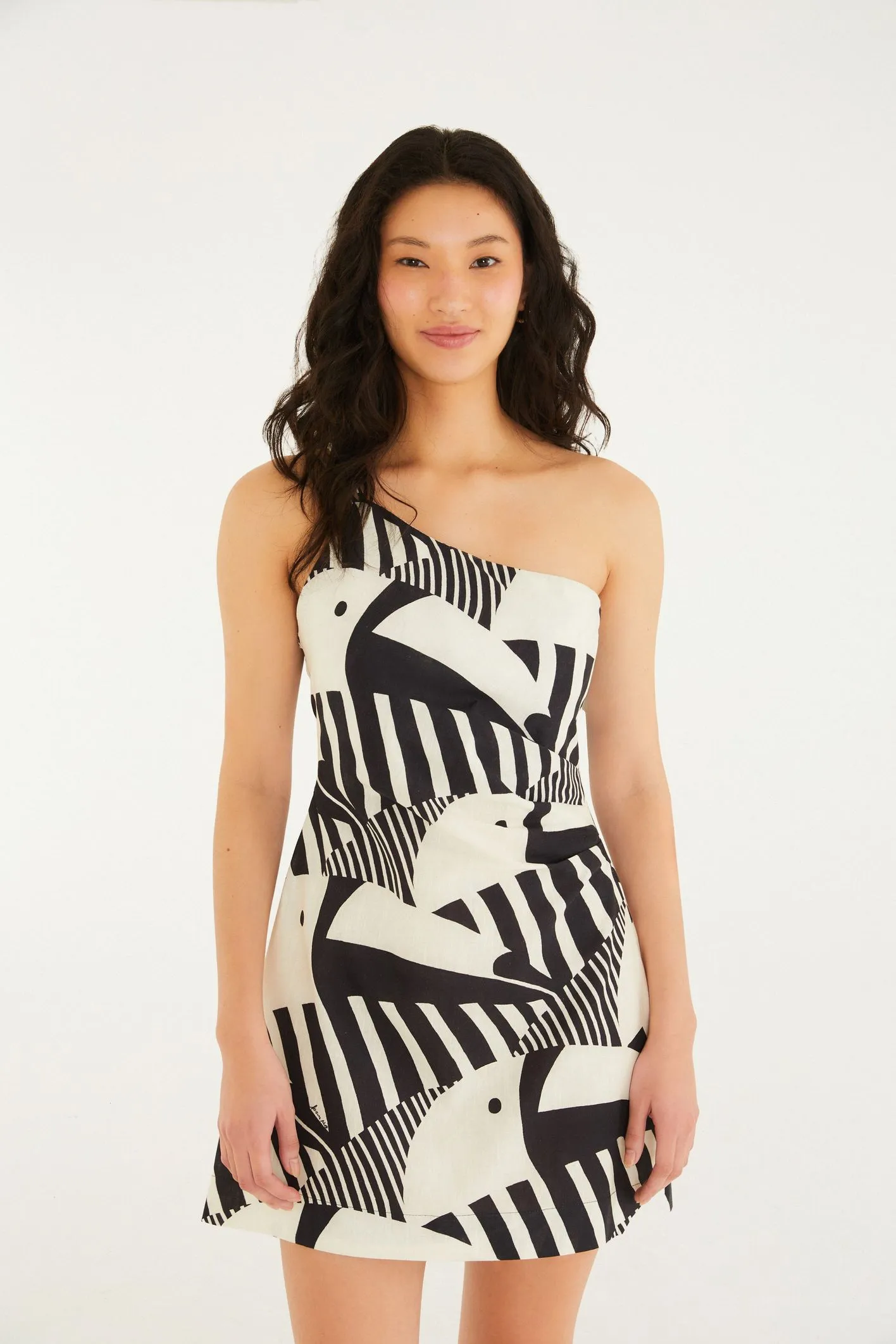 vestido curto tuca legal. com design diferenciado, apresenta alça única ajustável e ombros à mostra para um toque moderno. confeccionado em tecido leve, é perfeito para dias quentes ou ocasiões especiais. combinações variadas garantem um visual casual ou noturno, sempre com um toque único. FARM Rio, coleção Carioca – inverno 26.