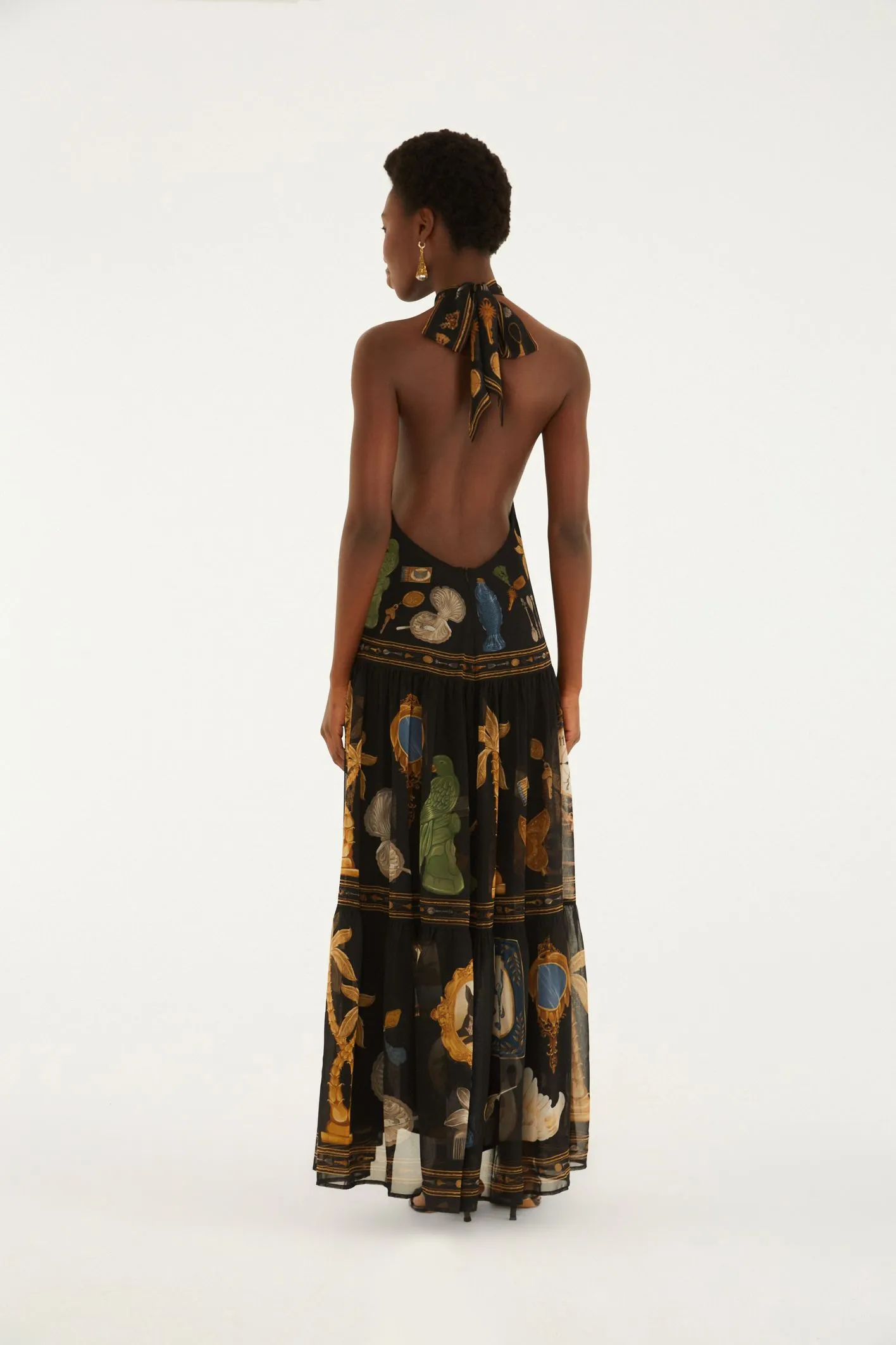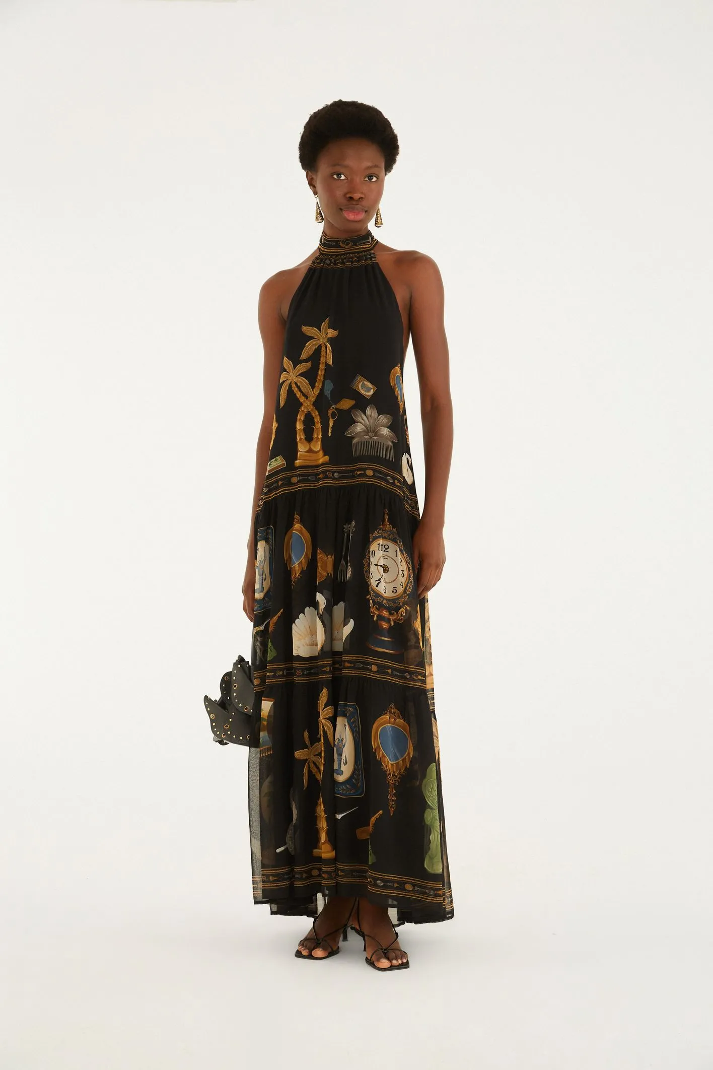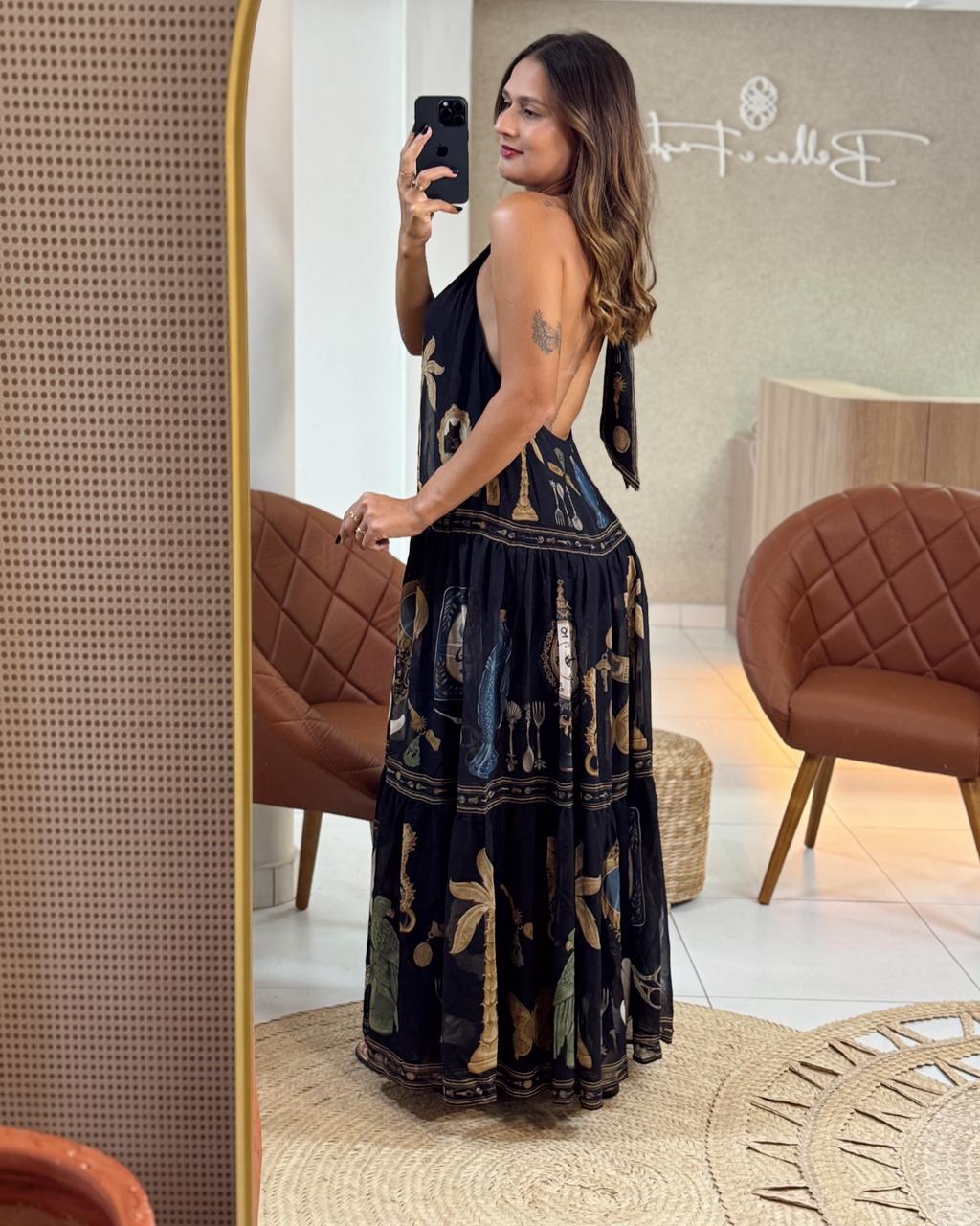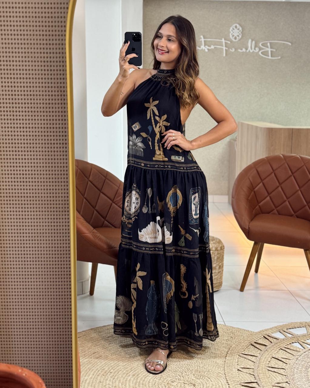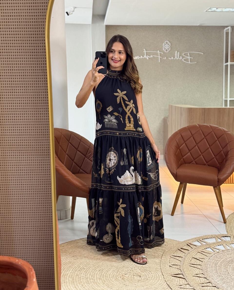 vestido longo bibelô. com gola alta e corte sem alças, este vestido traz um toque de originalidade e liberdade ao visual. o tecido leve e fluido proporciona um caimento perfeito. ideal para eventos ao ar livre ou jantares casuais. aproveite o estilo único e moderno. FARM Rio, coleção Carioca – inverno 26.
