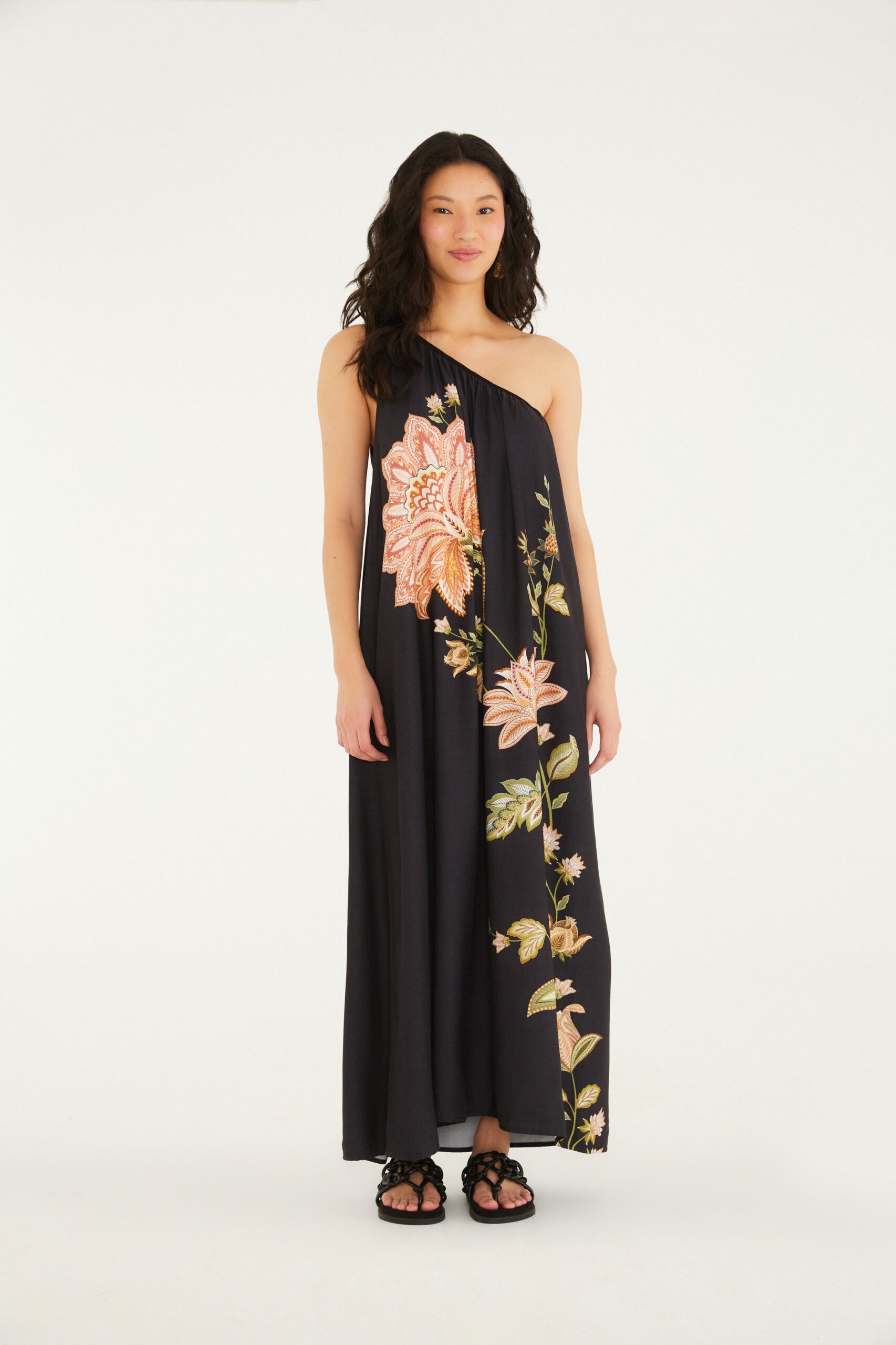 vestido longo jamile. com um design assimétrico e elegante, possui um corte fluido e alça única que destaca os ombros, permitindo um caimento leve e confortável. perfeito para ocasiões casuais e eventos especiais, essa peça transforma o visual com seu charme natural. FARM Rio, coleção Carioca – inverno 26.