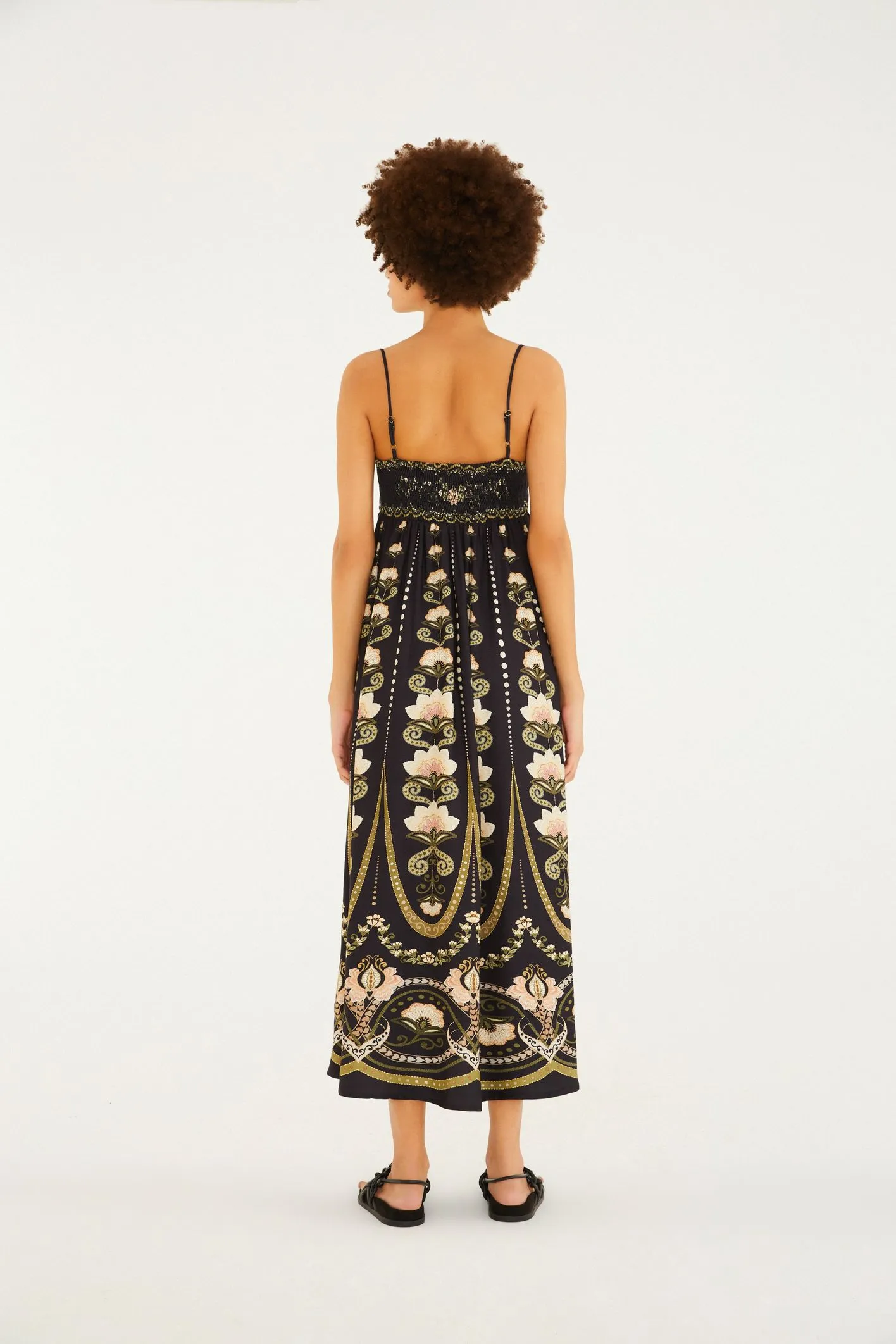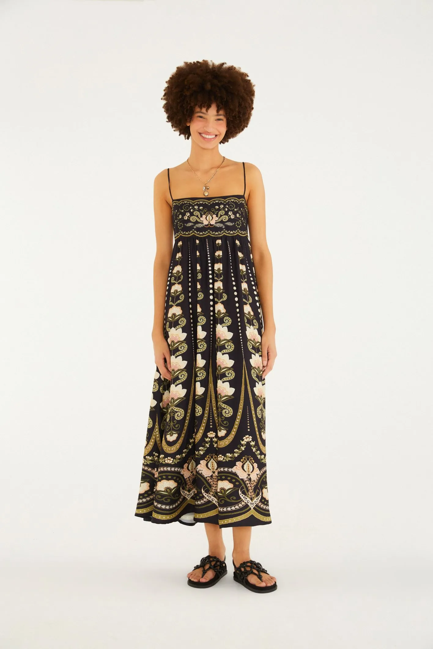 vestido longo nikita traz encanto com suas alças finas e decote reto, proporcionando uma modelagem fluida e confortável. o bordado rico em detalhes complementa o design, tornando-o perfeito para eventos especiais ou um passeio casual. uma peça versátil que conecta tradição e modernidade. FARM Rio, coleção Carioca – inverno 26.
