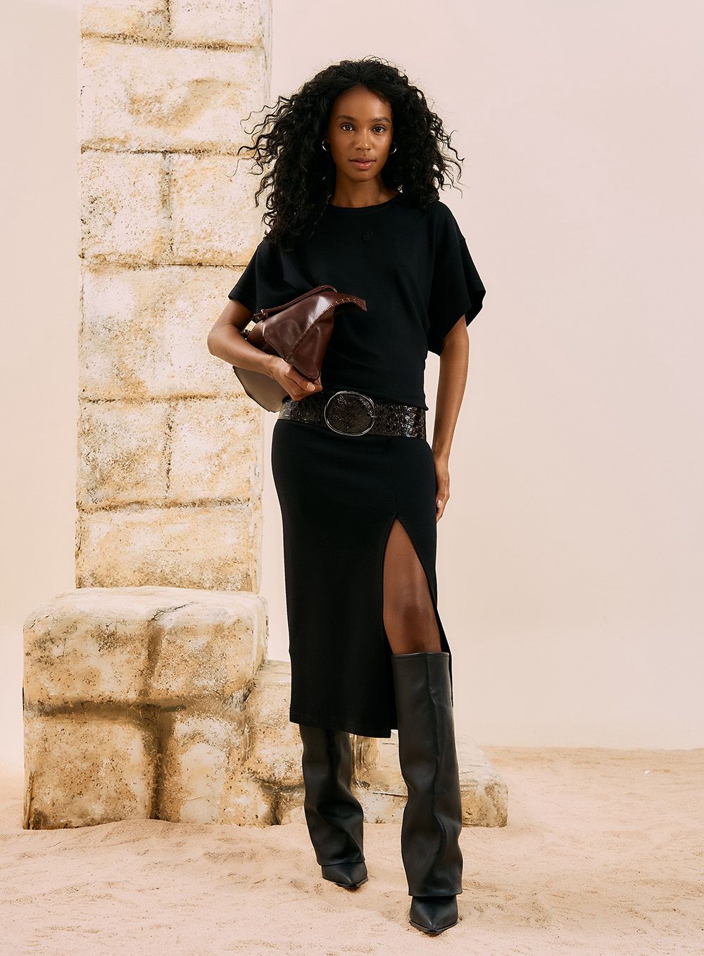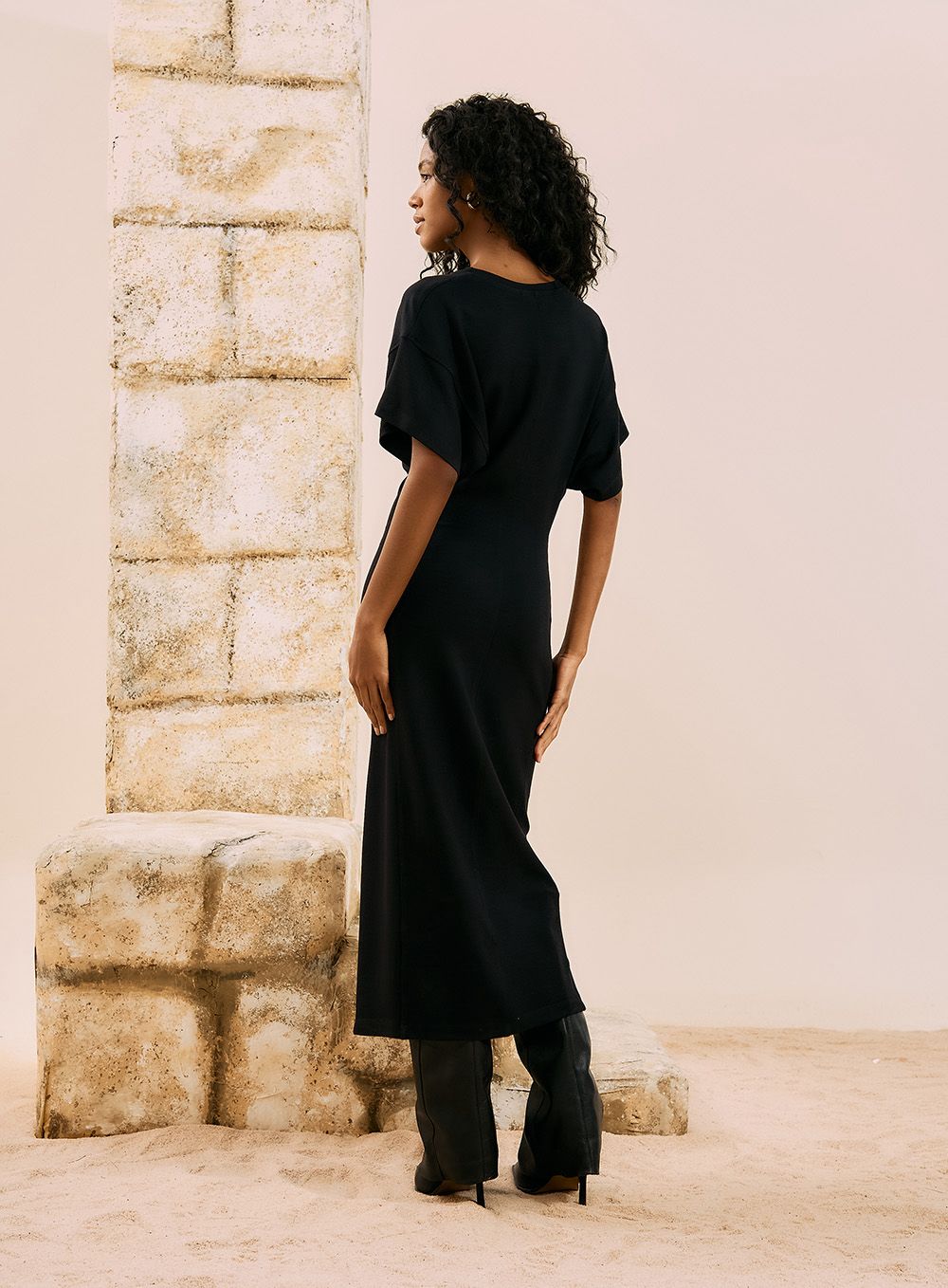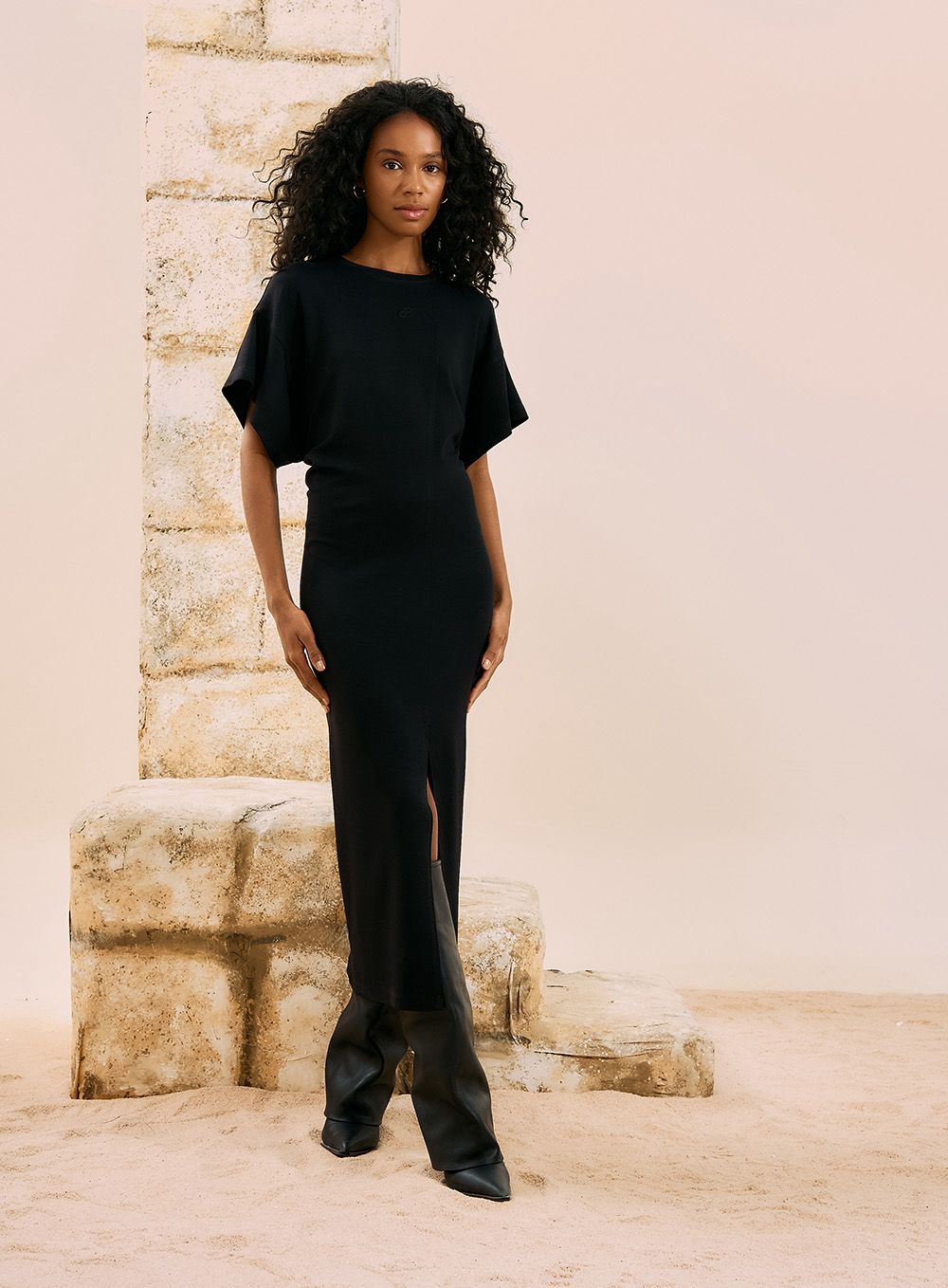 Design: Modelagem reta (column dress) com mangas curtas amplas e decote redondo clássico