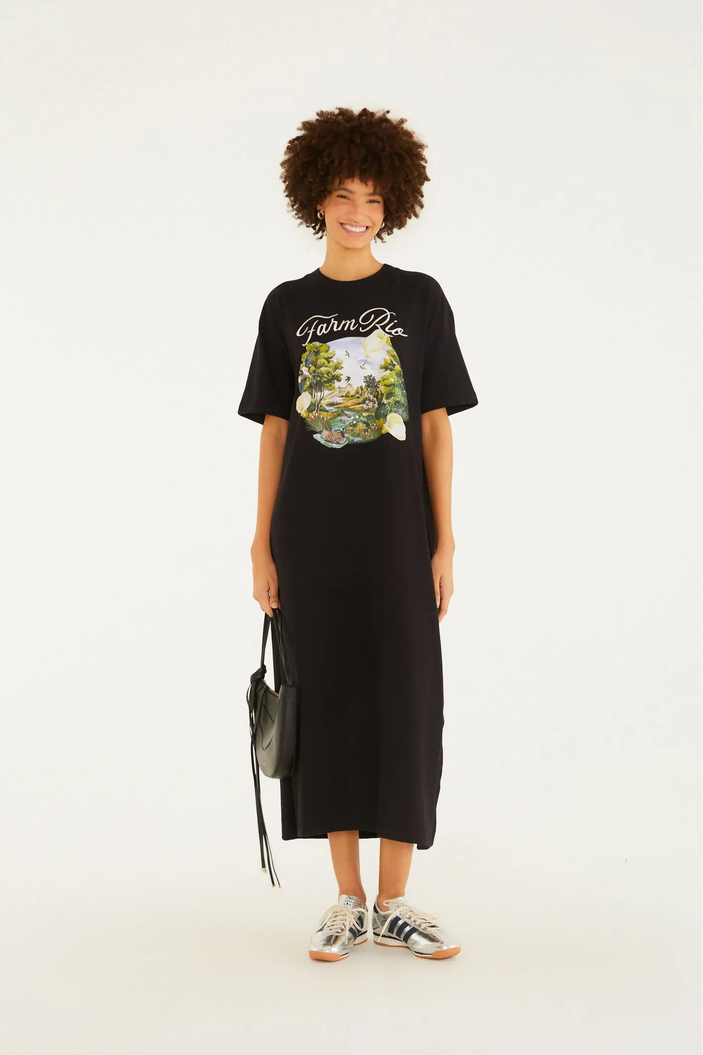 vestido midi portal paisagem do campo. com modelagem solta e mangas curtas, ele oferece conforto e estilo em uma única peça. o decote redondo traz um toque casual, enquanto a estampa única evoca a beleza serena do campo. ideal para um café ou um passeio no parque. FARM Rio, coleção Carioca – inverno 26.