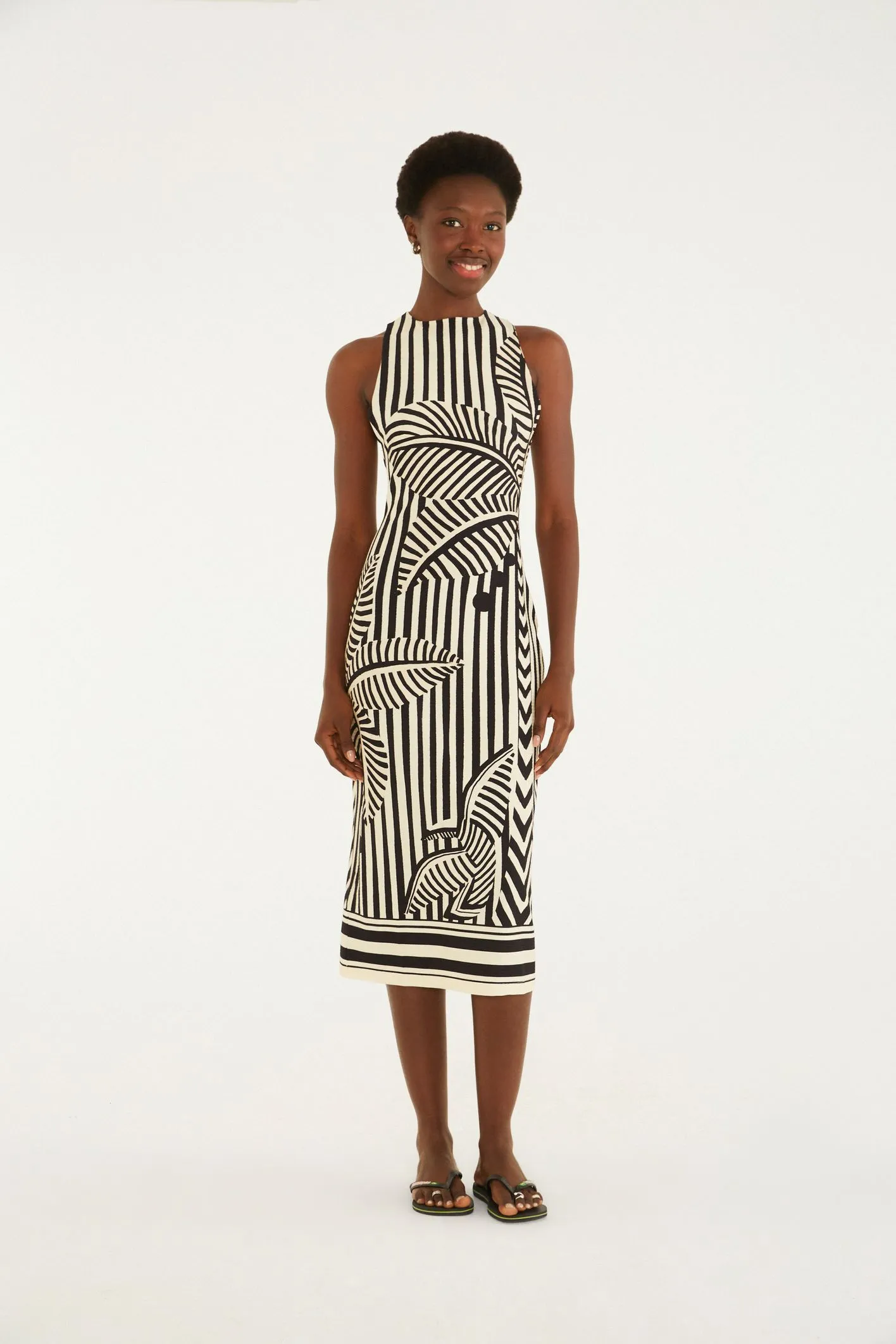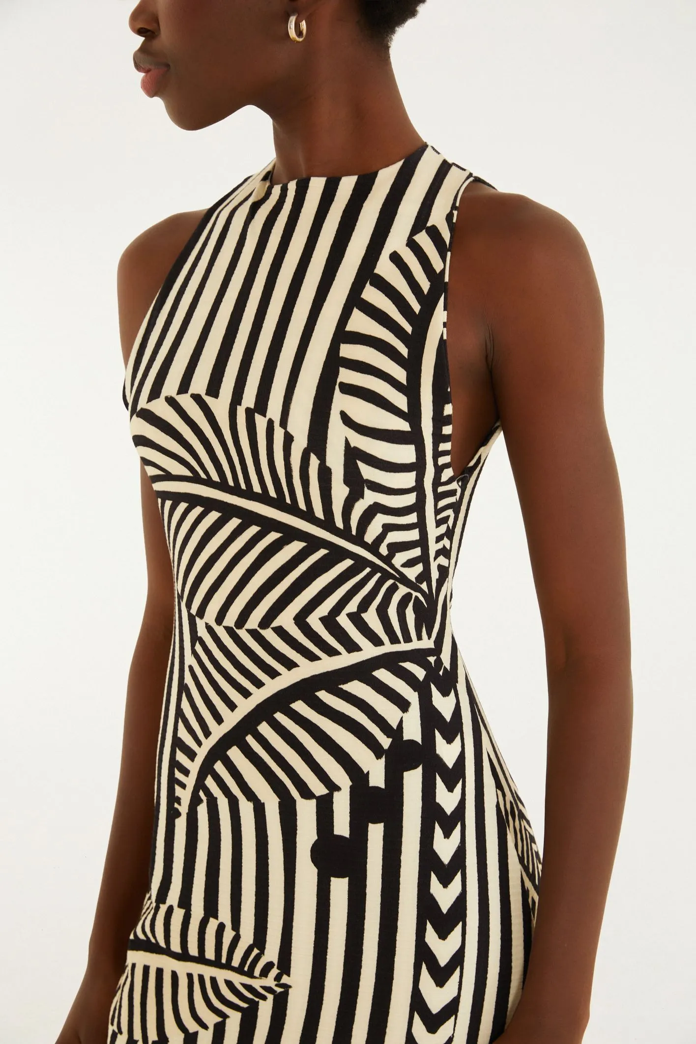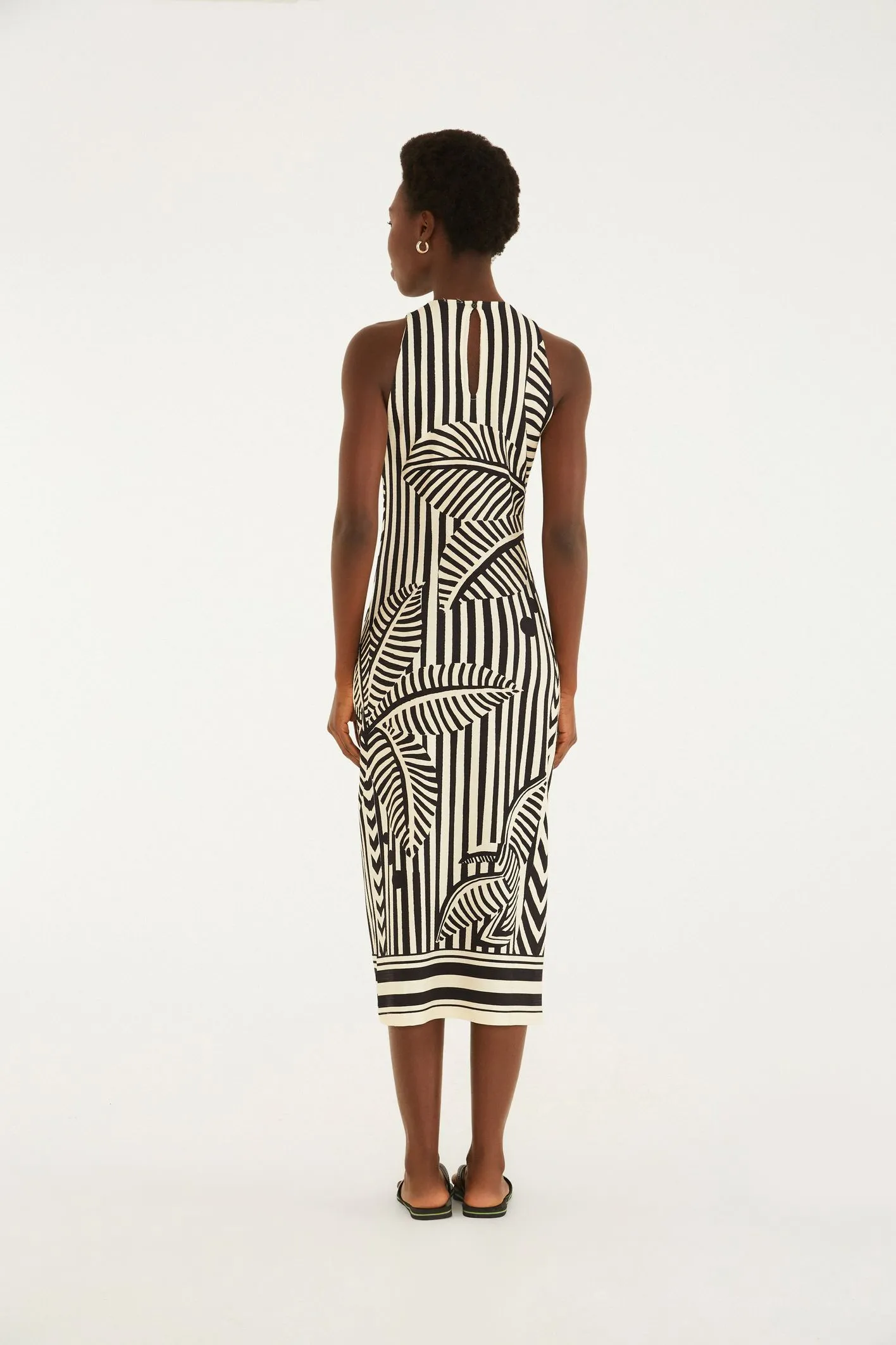 vestido midi listra tropical. com decote fechado e costas abertas, este vestido sem mangas apresenta modelagem ajustada que destaca a originalidade das listras. ideal para ocasiões especiais ou encontros casuais, eleva qualquer momento com um toque moderno e autêntico. FARM Rio, coleção Carioca – inverno 26.