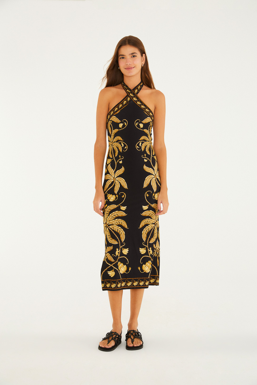 Ele é confeccionado em tecido preto com estampas douradas em estilo tropical, que apresentam elementos florais grandes e detalhes ornamentais em dourado, dando um aspecto elegante e sofisticado. O decote é em V na frente e o corte é reto na parte inferior, criando um visual moderno e elegante, perfeito para ocasiões especiais ou eventos de verão.