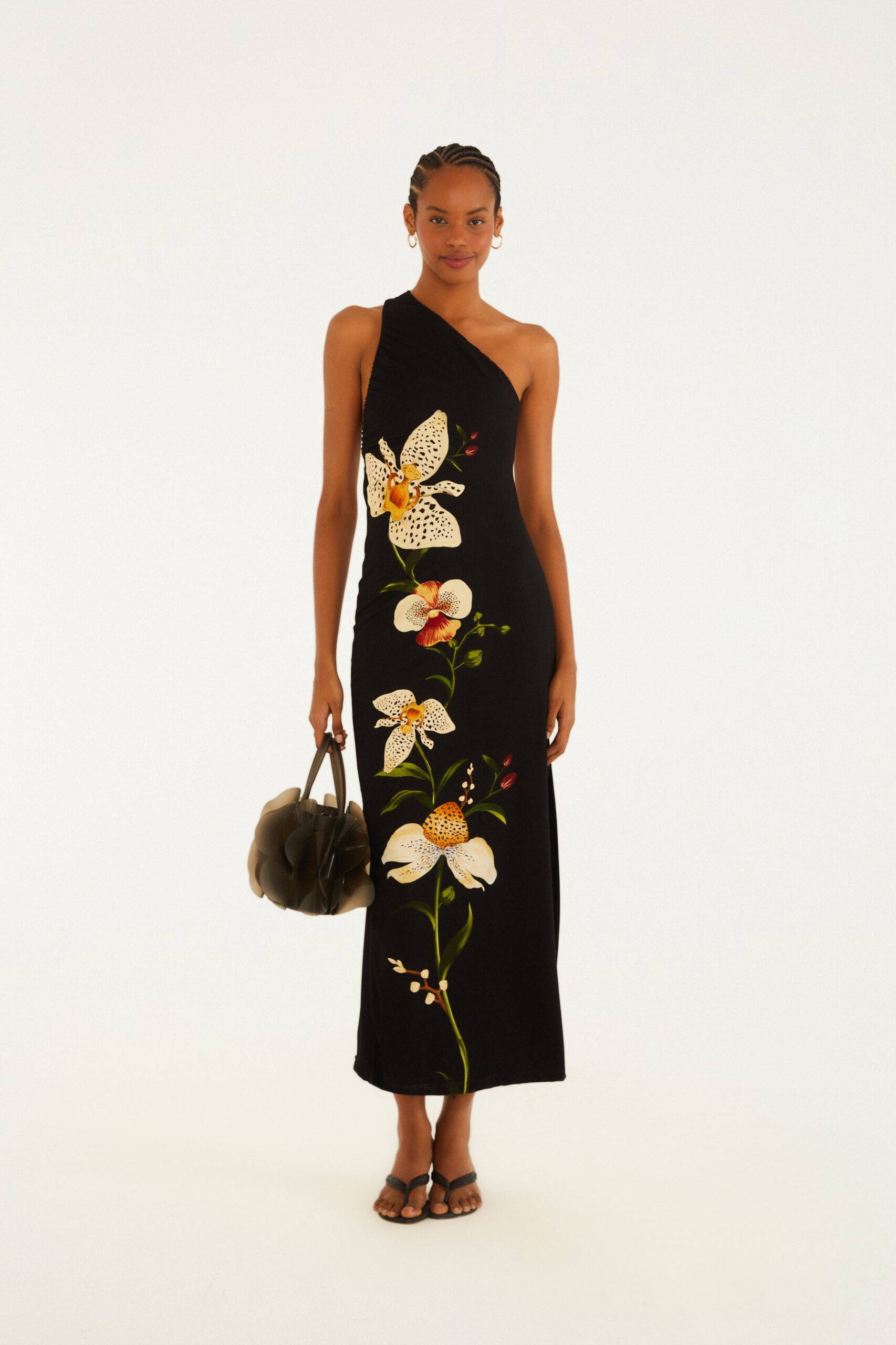 O vestido é um modelo longo de uma manga só (assimétrico, com um ombro descoberto), de tecido preto com estampa floral em destaque. A estampa apresenta orquídeas brancas com manchas amarelas/orange e detalhes vermelhos nas folhas e botões, dispostas em uma haste verde que percorre diagonalmente o vestido, desde o ombro até próximo ao chão. O visual é complementado por uma bolsa cinza escura na mão direita e sandálias pretas.