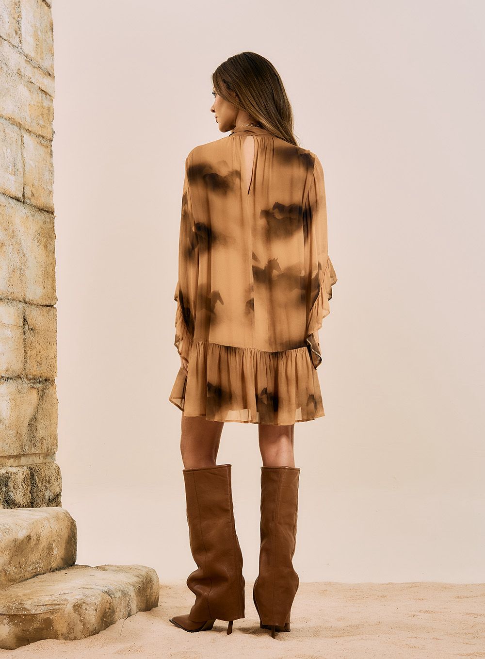 Este vestido da Open apresenta uma estética “boho-chic” contemporânea, marcada pela leveza do tecido e uma paleta de cores terrosas que evoca sofisticação e fluidez.