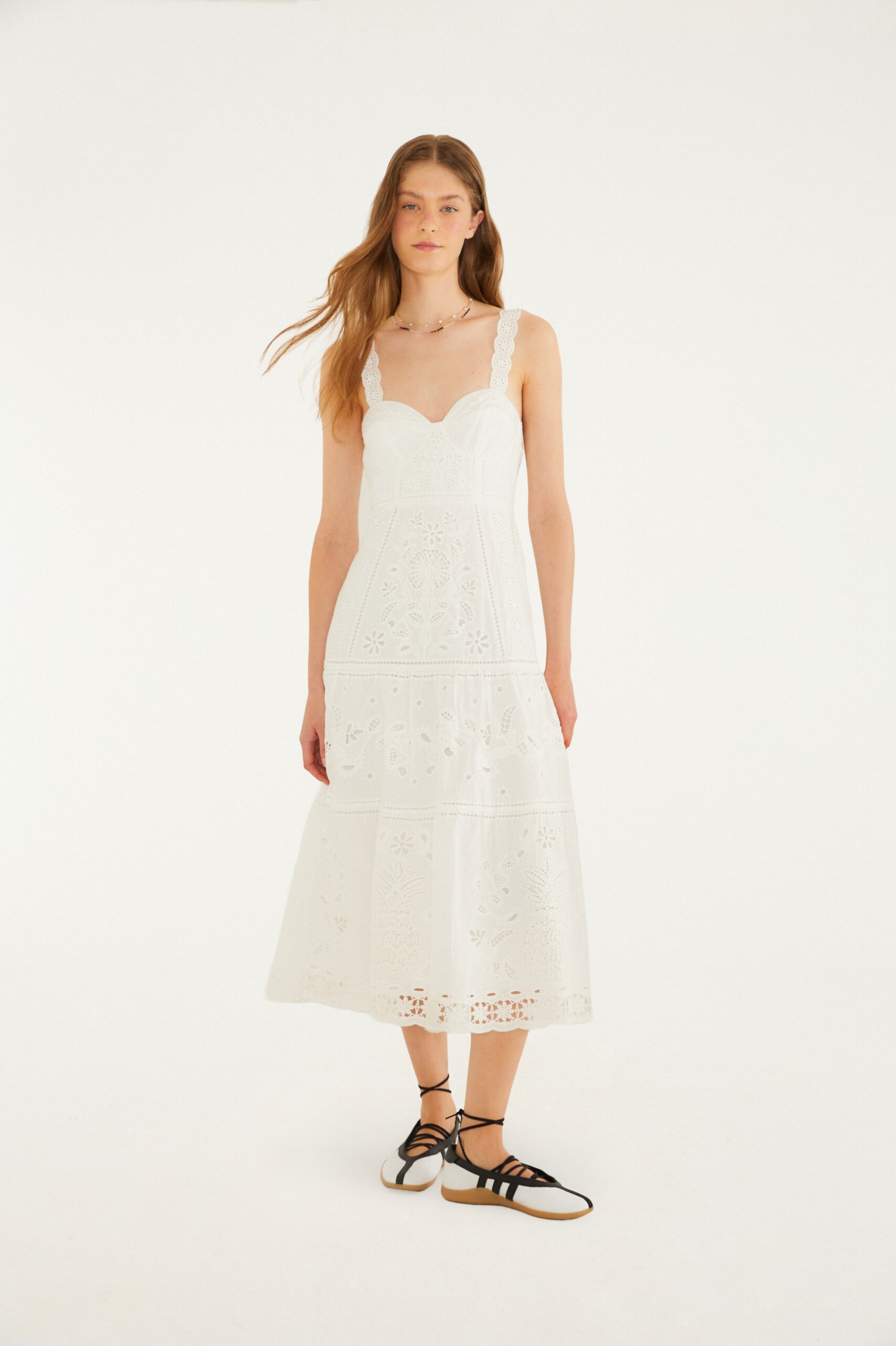 vestido Richelieu floral mariana. um toque de frescor com alças finas e decote coração que elevam seu visual. a cintura bem definida se abre para uma saia com camadas charmosas e acabamento Richelieu, trazendo um ar artesanal. perfeito para um passeio casual ou um encontro especial. versatilidade e estilo em qualquer ocasião. FARM RIO original – verão 26.