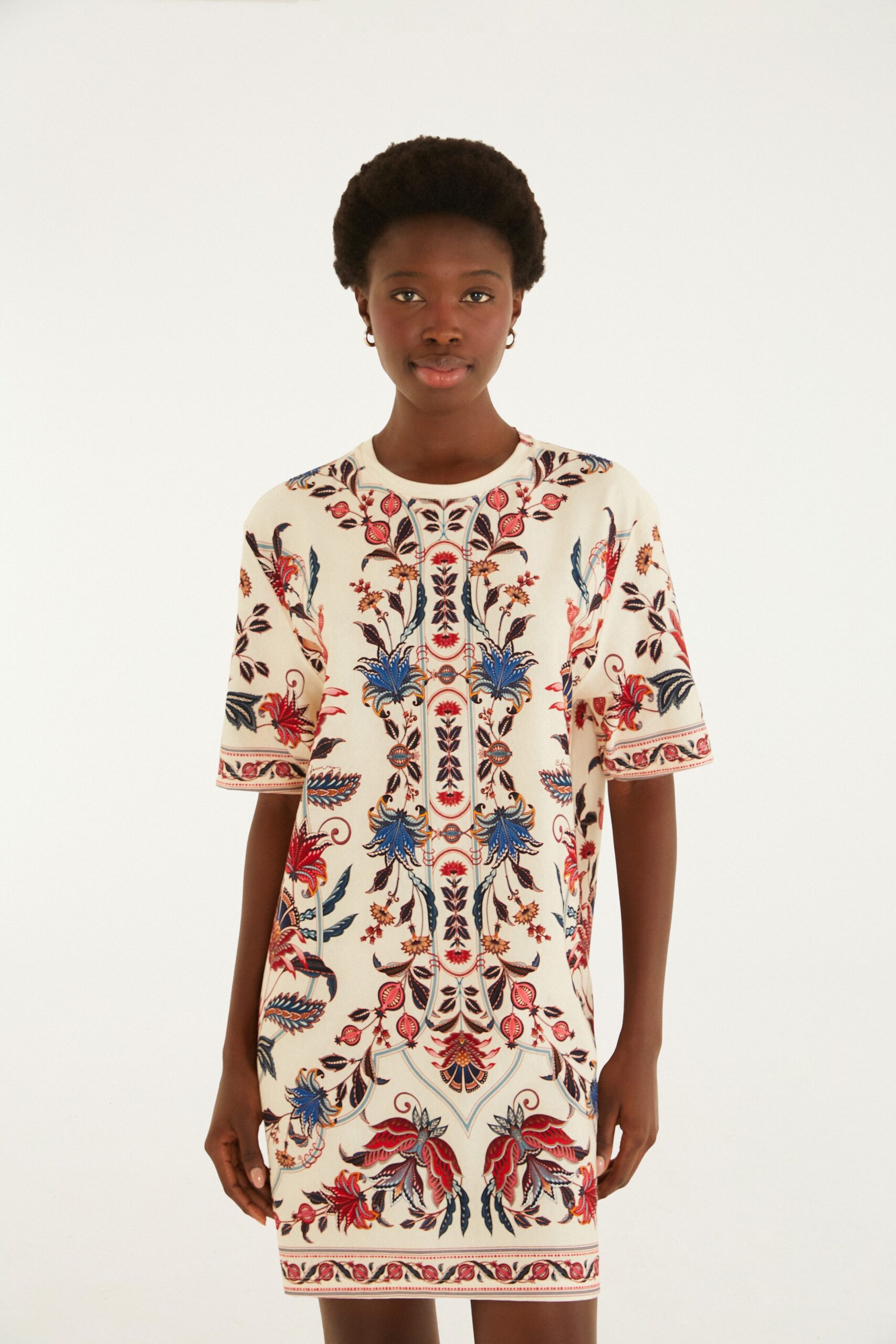 vestido tshirt basico bohoflor. o modelo apresenta decote redondo e mangas curtas que proporcionam liberdade e leveza. a estampa exclusiva chama atenção, trazendo originalidade à peça. ideal para ocasiões casuais, acompanha bem momentos relaxantes e despojados. o conforto é garantido pelo corte solto e pelo tecido suave. FARM Rio, coleção Carioca – inverno 26.