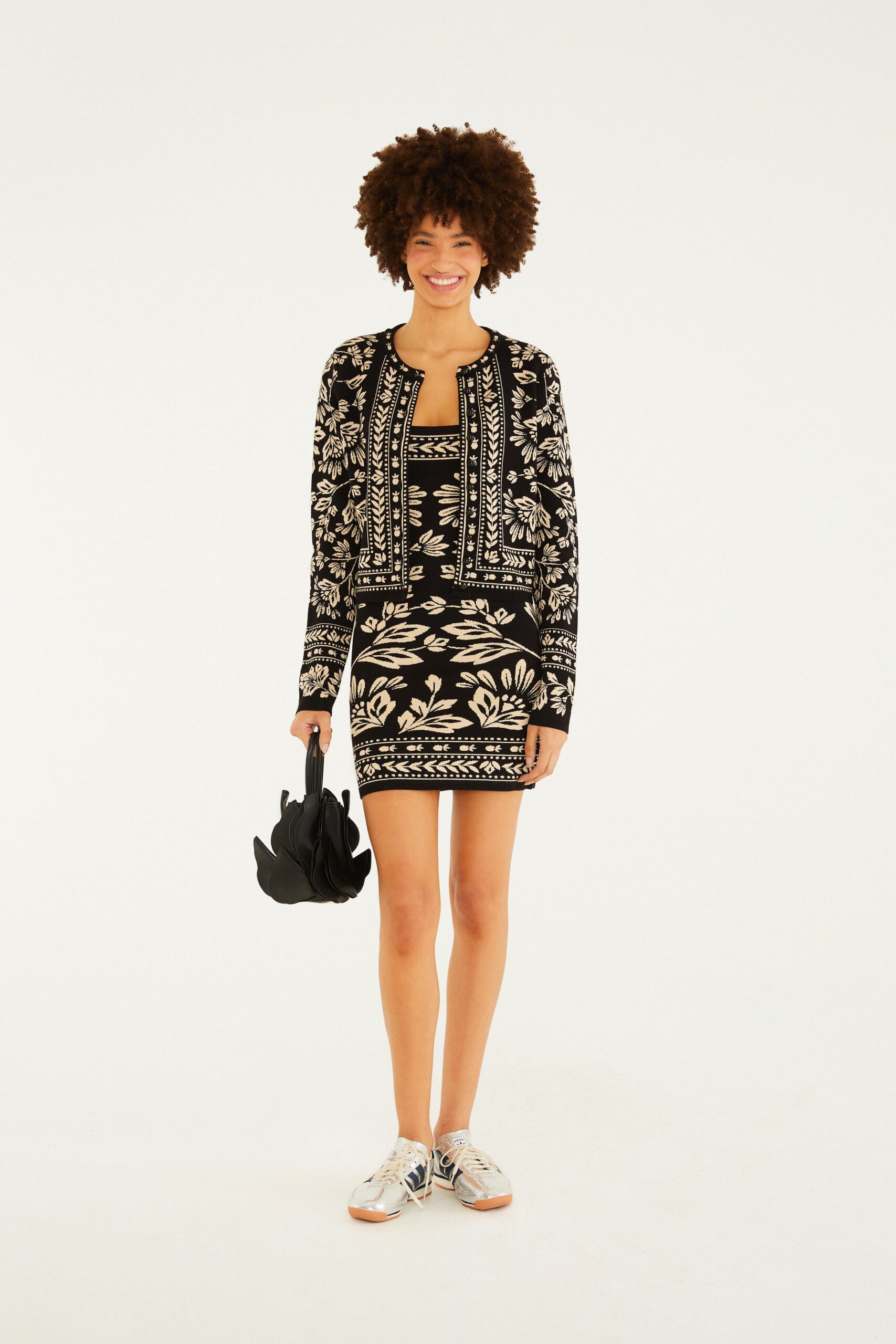 vestido tricot curto. traz alças largas que garantem conforto e versatilidade. o decote quadrado eleva o visual casual, enquanto o tricô detalhado oferece textura única. perfeito para encontros casuais ou saídas à noite, é uma peça-chave no guarda-roupa. FARM Rio, coleção Carioca – inverno 26.