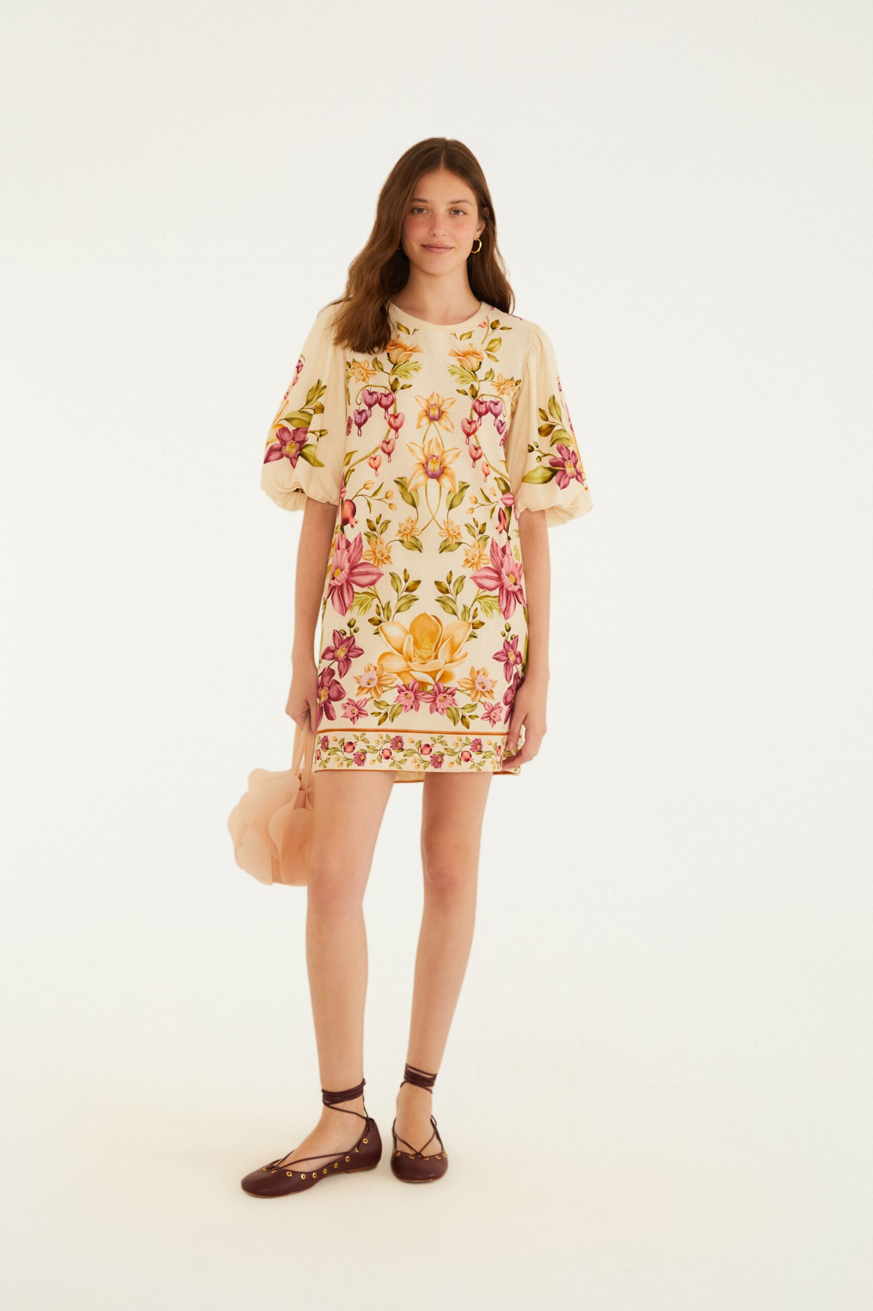 O vestido é um modelo curto, de manga curta e bufante, com um tecido creme adornado por um estampado floral colorido. As flores são grandes e pequenas, em tons de rosa, laranja e verde, distribuídas por todo o vestido e com uma faixa floral na parte inferior da saia. O estilo é casual e elegante, combinando bem com os sapatos marrons de alça e a bolsa bege na mão.