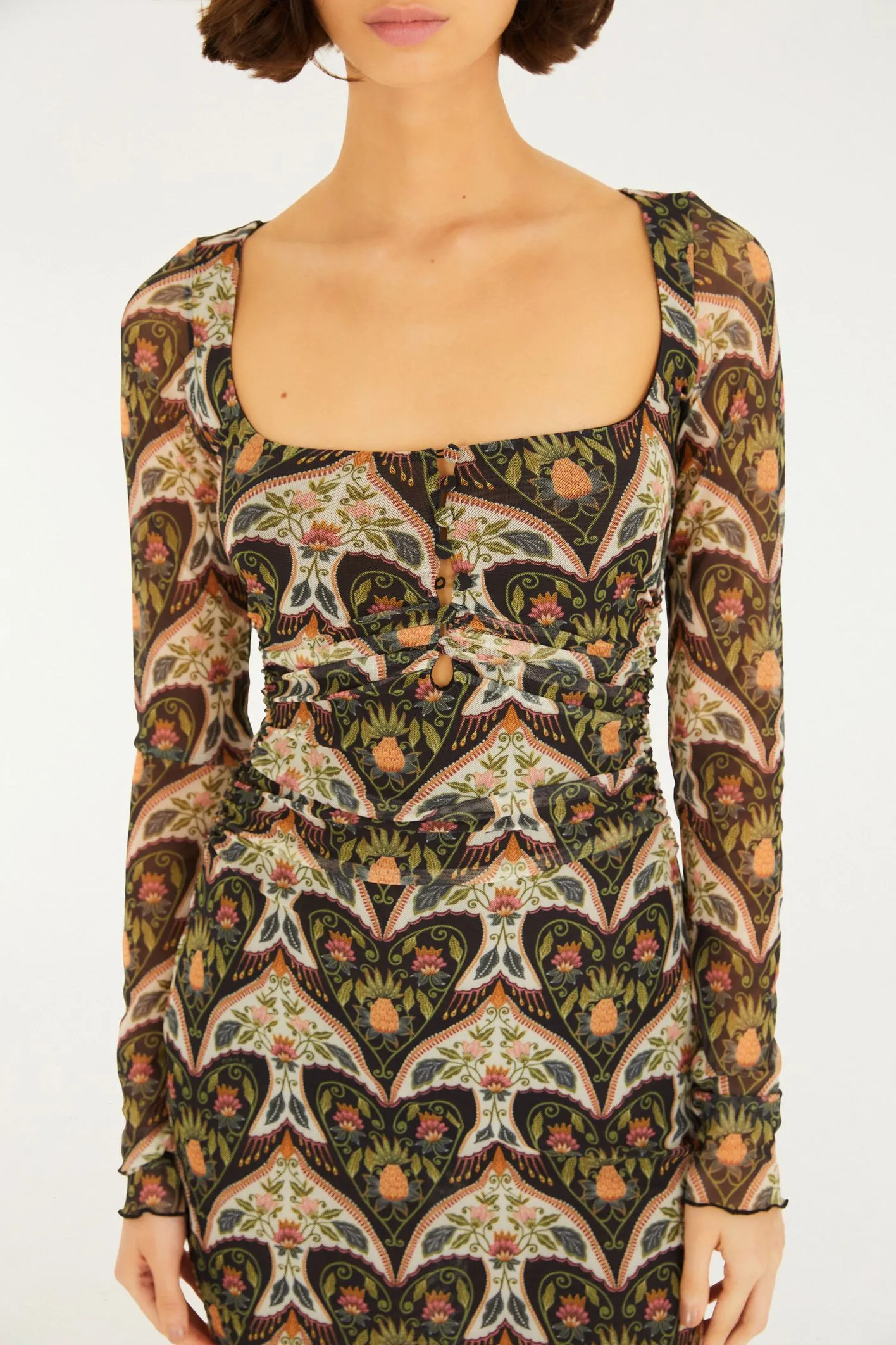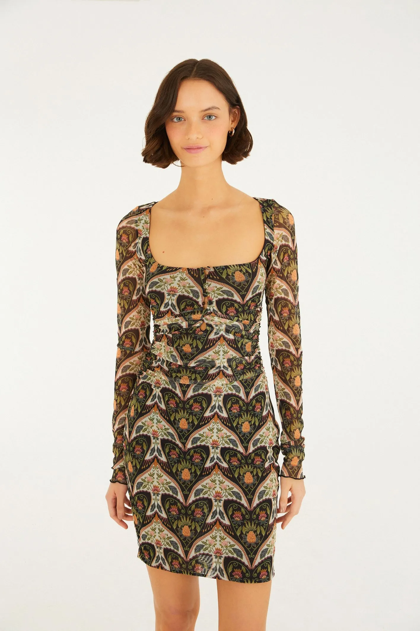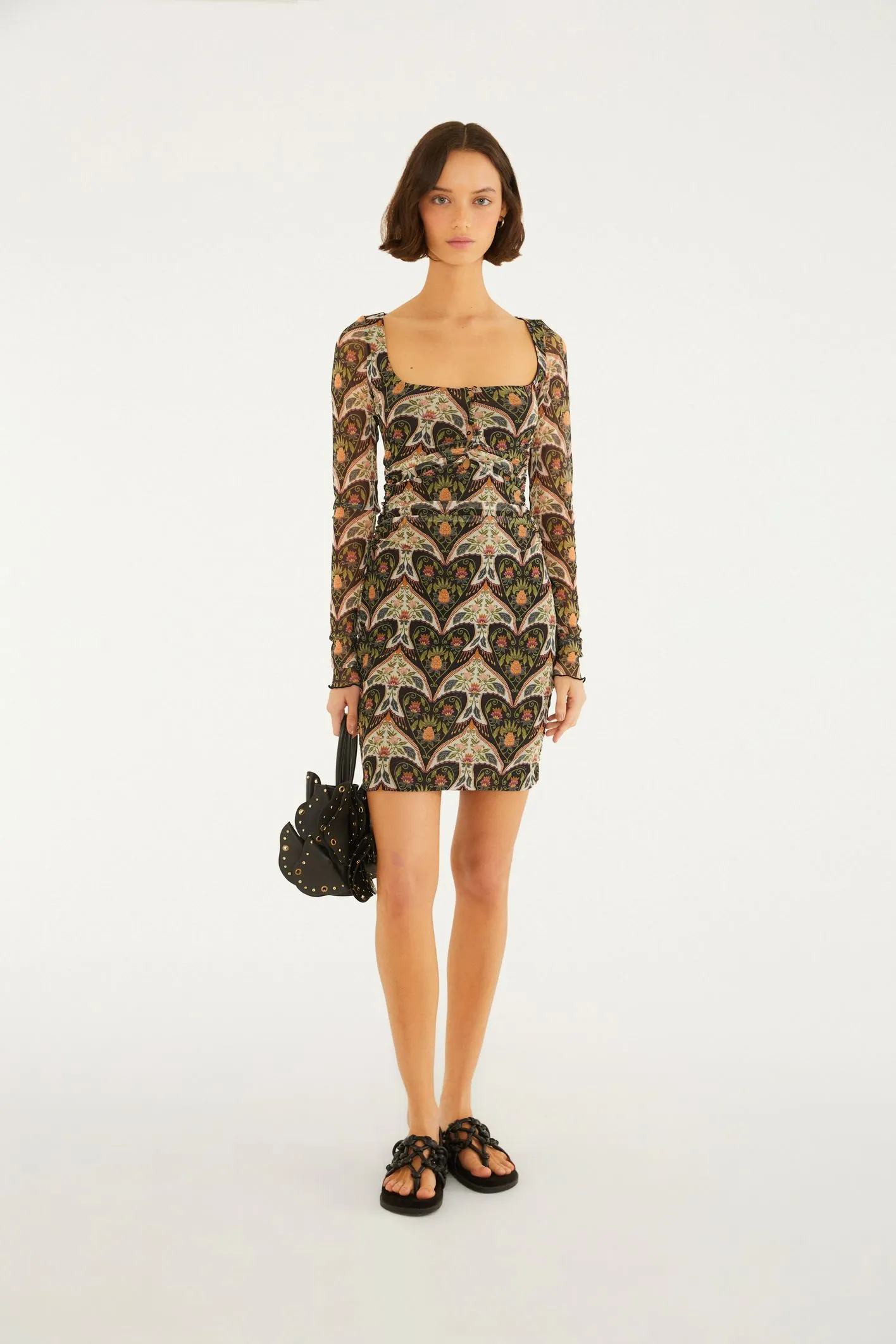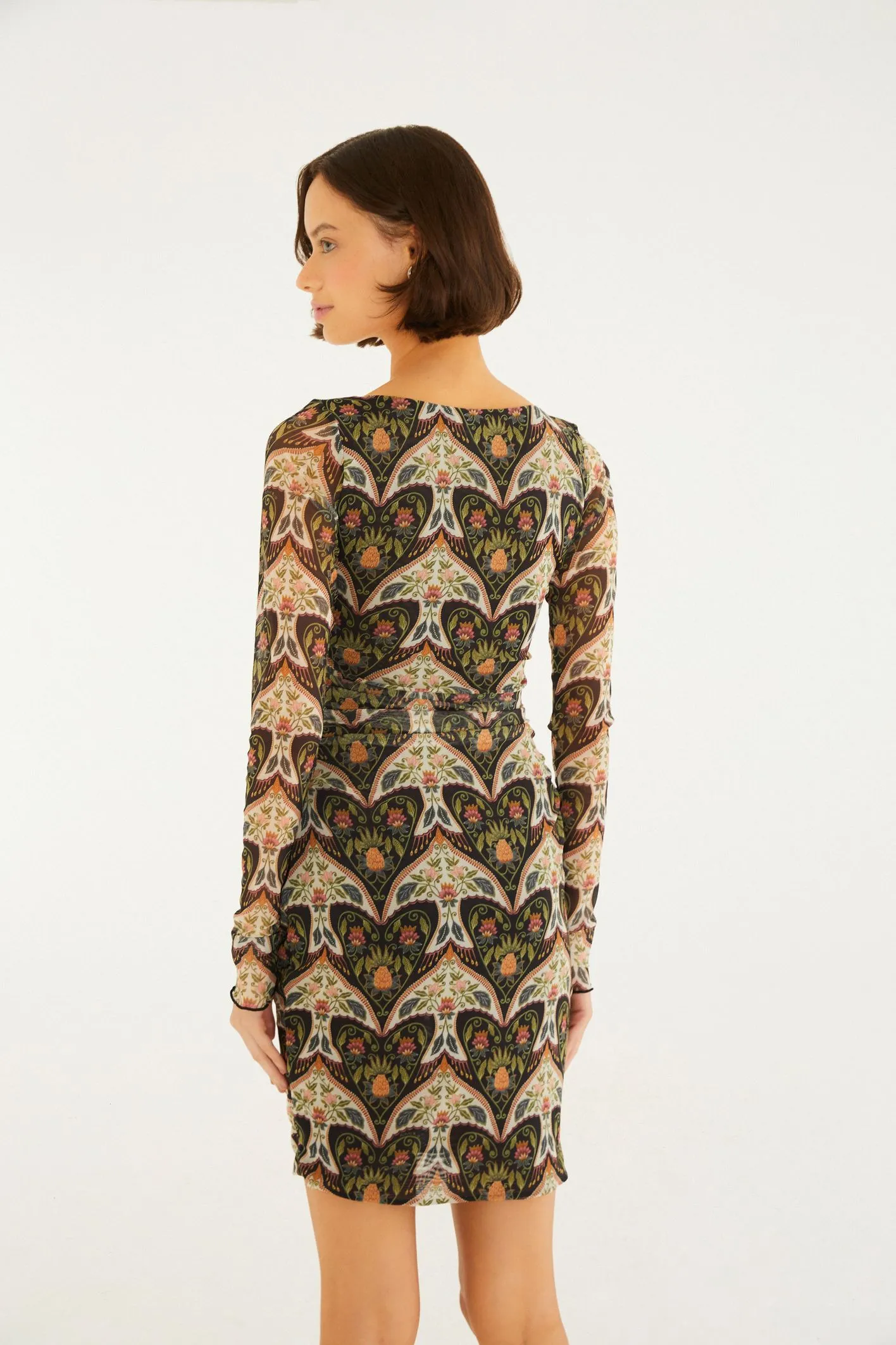 vestido tule curto andorinha. com mangas longas ajustadas e decote quadrado, a peça se destaca pela leveza do tecido em tule, garantindo fluidez e um caimento casual. a modelagem é ideal para ocasiões que pedem conforto e estilo, seja em um passeio ou em um evento especial. FARM Rio, coleção Carioca – inverno 26.